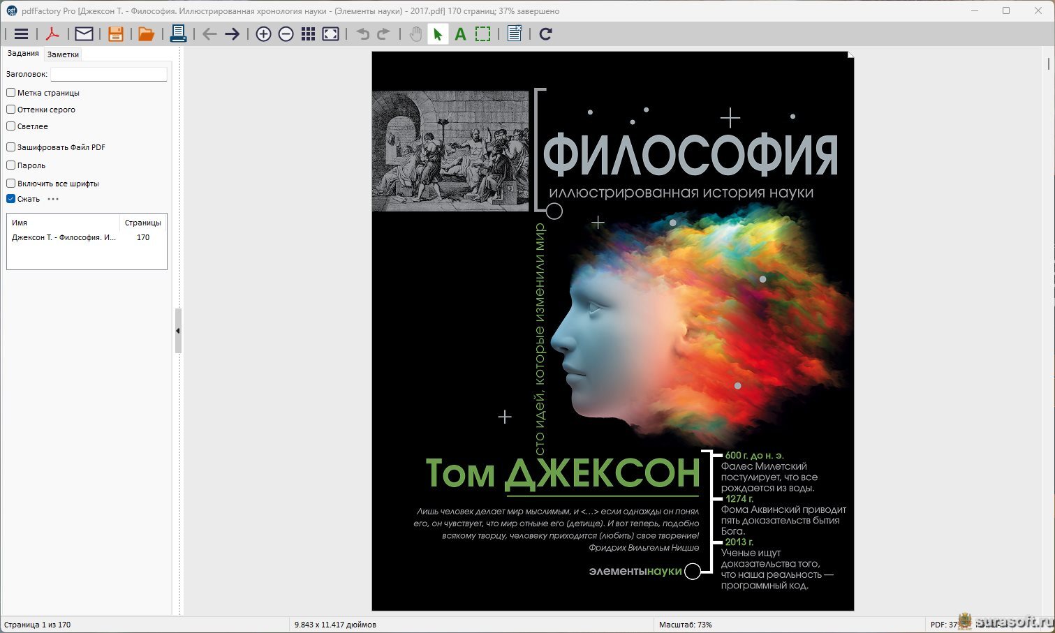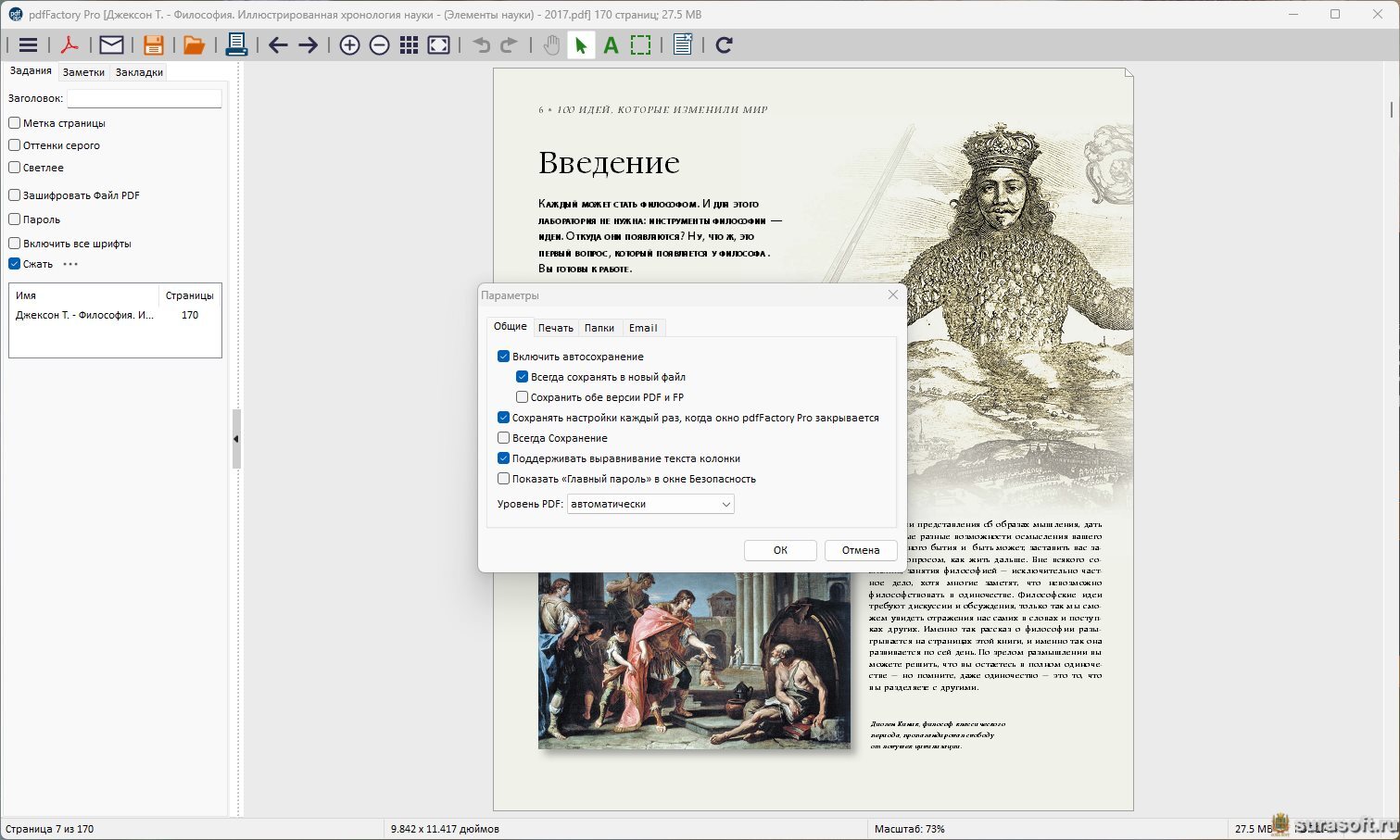 Описание: pdfFactory Pro - удобное приложение, представляющее из себя драйвер виртуального принтера, создающий документы в формате PDF. Поддерживает создание PDF-проектов из нескольких документов или файлов, имеет режим предварительного просмотра. Возможна установка запрета на редактирование документа, его шифрование и установка пароля на открытие. В профессиональной версии, в отличие от стандартной, существует возможность добавления номеров страниц, верхних и нижних колонтитулов, водяных знаков, создания закладок и ряд других дополнений. В третьей версии добавлена функция сохранения в формат FP, возможность настройки пользовательского интерфейса, настройка графики для цветных и монохромных файлов в отсканированных документах.