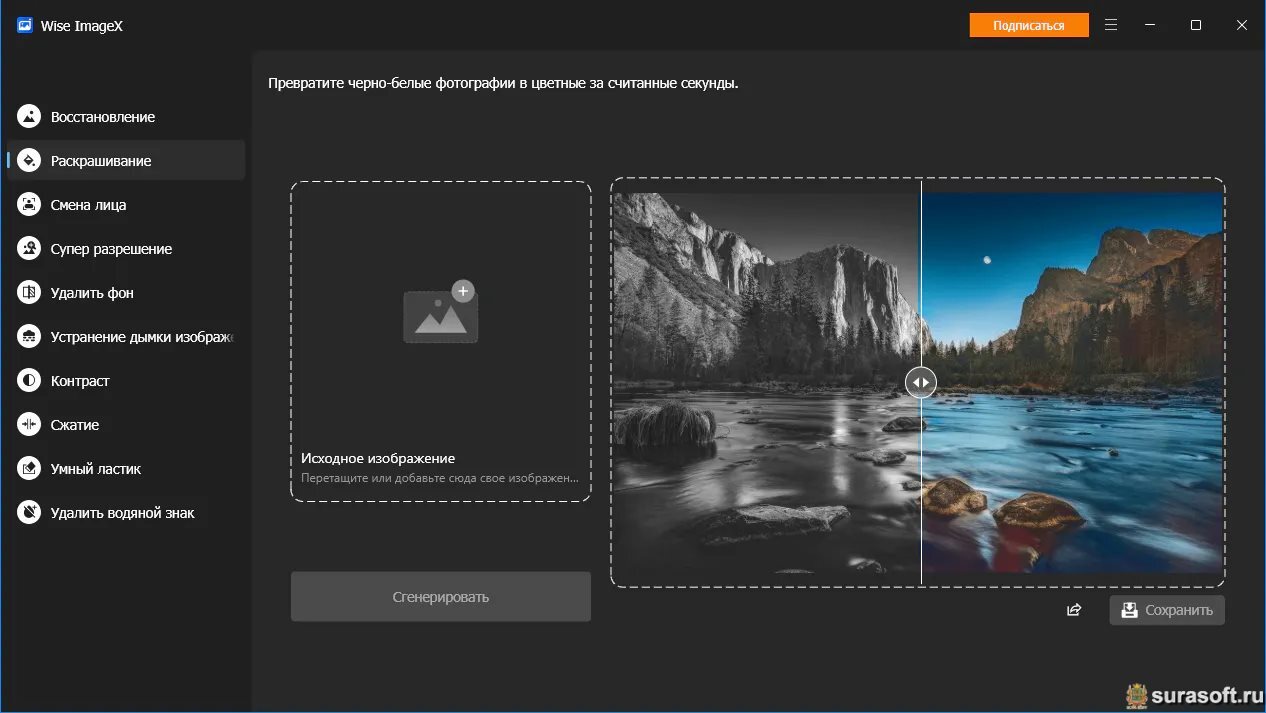 Благодаря технологии восстановления фотографий на базе искусственного интеллекта Wise ImageX поможет вам легко восстановить старые, размытые, изношенные, выцветшие и поврежденные фотографии, в результате чего вы получите четкие изображения высокого качества, которые сохранят ваши драгоценные воспоминания. • Раскрашивание изображений.