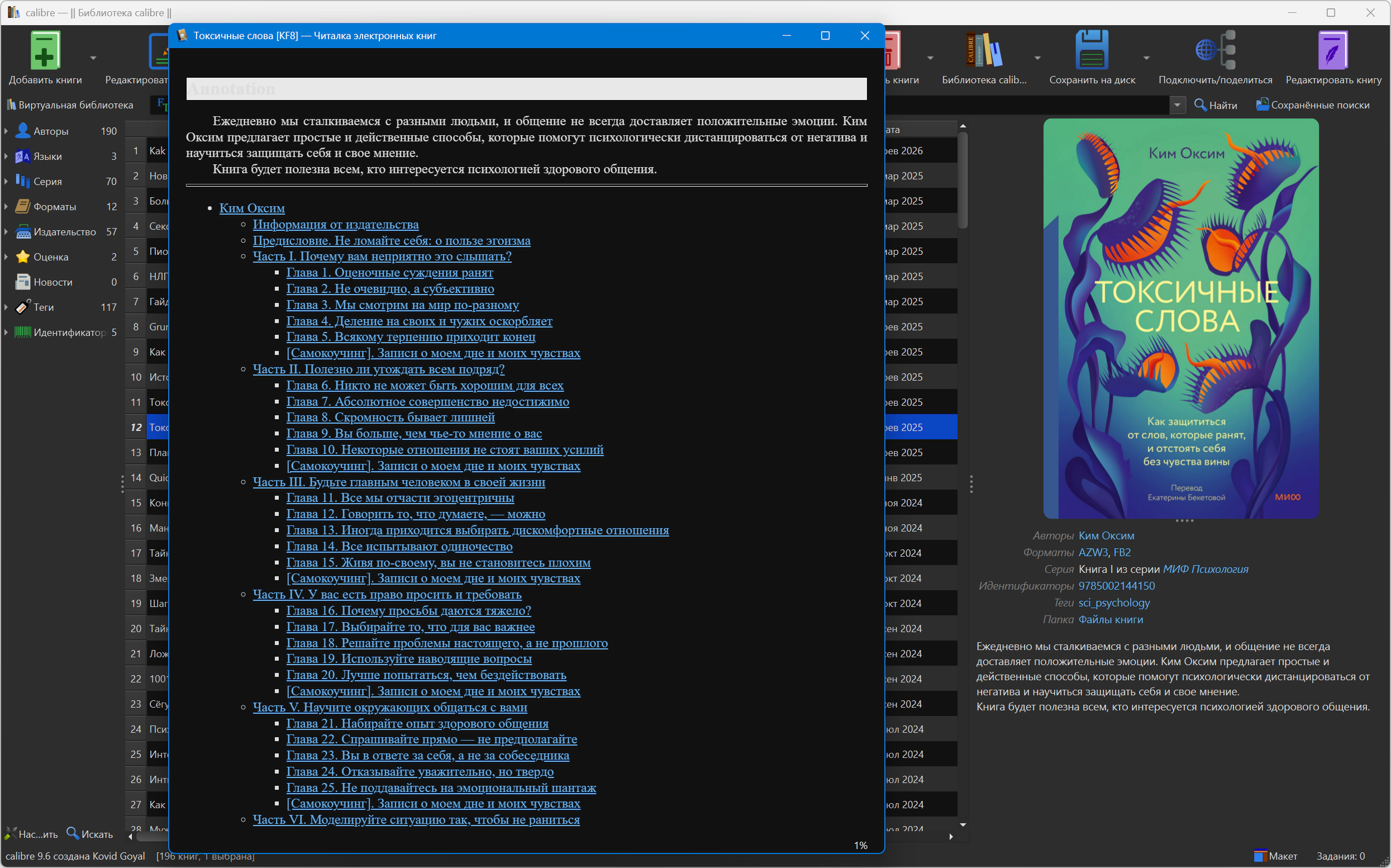 Calibre предоставляет возможность управление вашей коллекцией книг. Концепция программы — множество одинаковых книг в разных форматах представлены как одна книга в библиотеке.