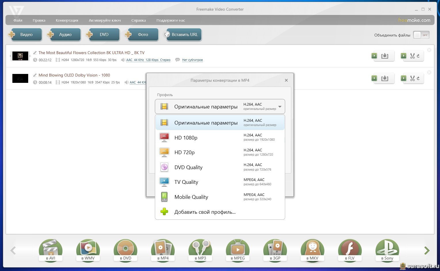 Конвертируйте HD видео без потери качества. Freemake с легкостью обрабатывает видео 4K, Full HD 1080p, HD 720p с любых HD камер.