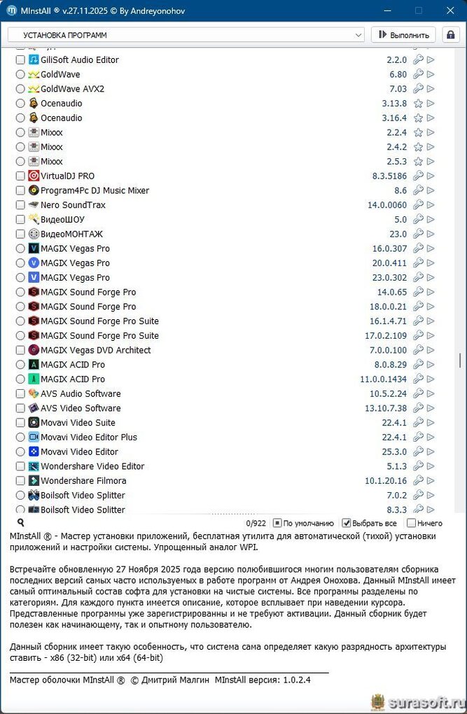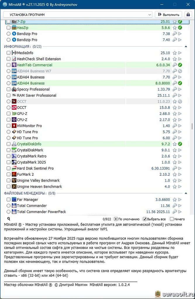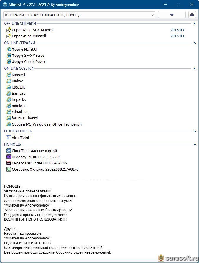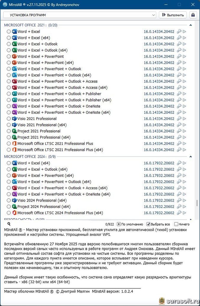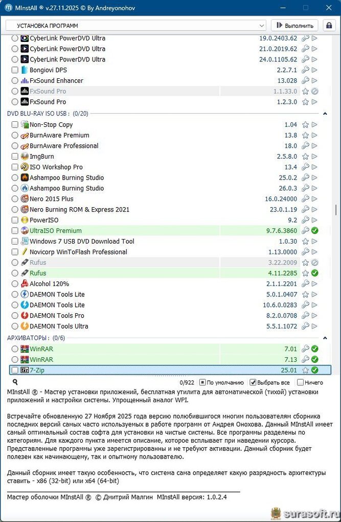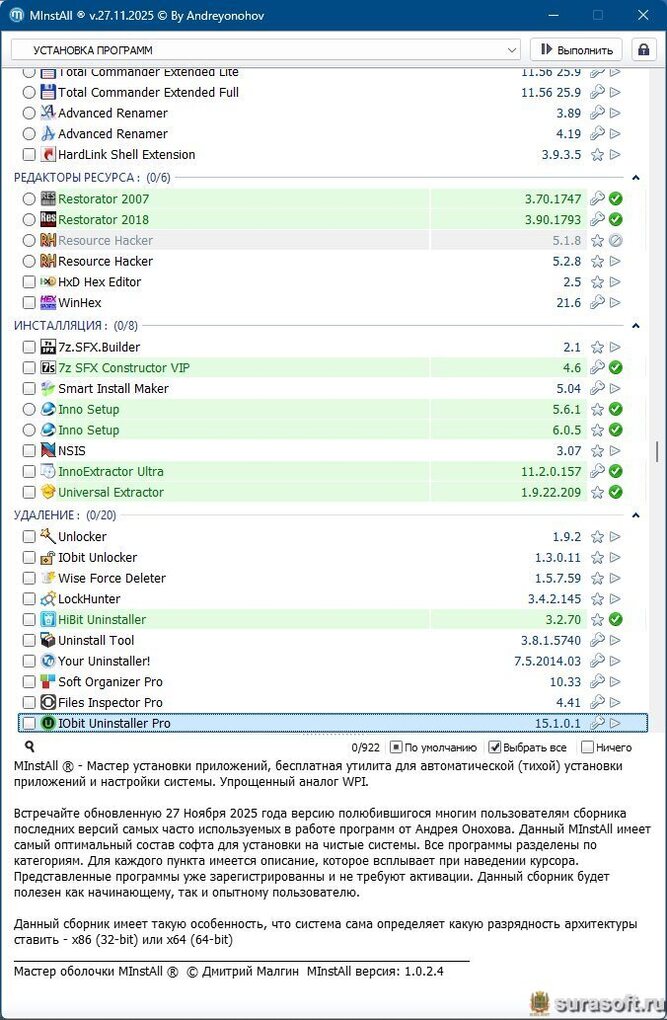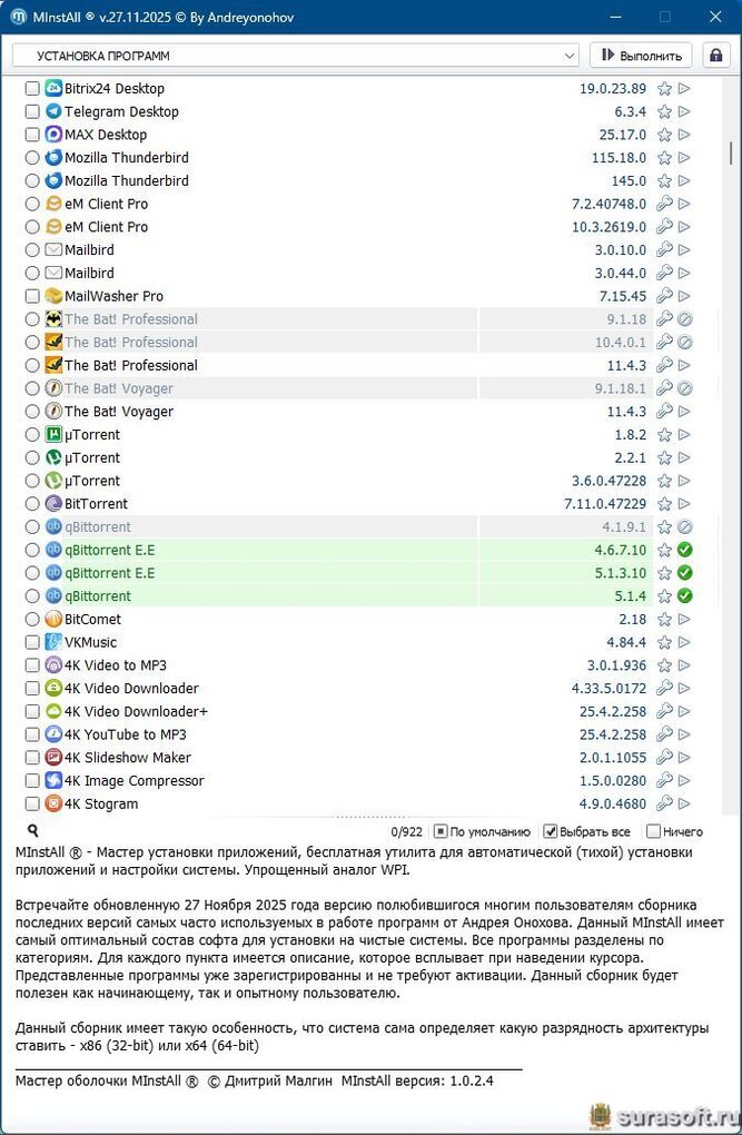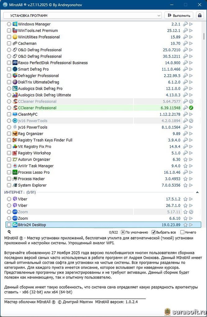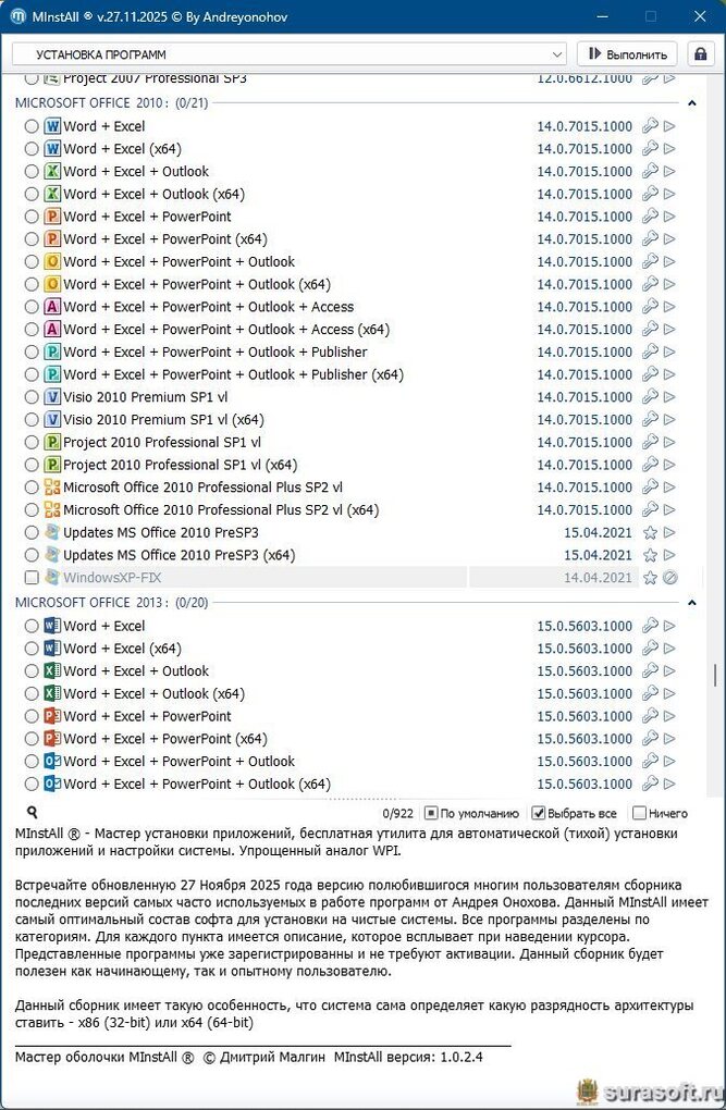 Версия программы: v.27.11.2025Официальный сайт: MInstAll By Andreyonohov Язык интерфейса: РусскийЛечение: не требуется (инсталлятор уже пролечен) Системные требования: • Windows XP - 11 Описание: Перед Вами обновленный 27 Ноября 2025 года полюбившийся многим пользователям сборник последних версий самых часто используемых в работе программ от Андрея Онохова. Теперь в новой, более простой и удобной оболочке MInstAll - это новый мастер установки приложений, упрощенный аналог WPI. Данный MInstAll имеет самый оптимальный состав софта для установки на чистые системы. Представленные программы уже зарегистрированы и не требуют активации. ВАЖНО:• Ко многим программам применены "лекарства".• Поэтому во избежании ложных срабатываний антивирусов рекомендуется их отключить или добавить исключения. Особенности:• Все программы разделены по категориям.• Для каждого пункта имеется описание, которое появляется внизу окна при наведении курсора. • Данный сборник будет полезен как начинающему, так и опытному пользователю. • Данный сборник имеет такую особенность, что система сама определяет какую разрядность архитектуры ставить - x86 (32-bit) или x64 (64-bit). • Обо всех изменениях по сравнению с предыдущей версией читайте ниже. Список программ x86/x64 от 27.11.2025:• АКТИВАЦИЯ:Windows & Office 10.5 KMS Tools Lite Portable 24_10_2025 KMS Tools Portable 08_03_2025 -KMSoffline v2.4.7 RU EN -Activation Program v1.07/v1.14/v1.15 Portable -AAct v4.3.2 Portable -AAct Network v1.4.3 Portable -KMSAuto Lite Portable v1.9.9.9 b06 -W10 Digital Activation Program Portable v1.5.5.4/v1.5.5.5 -Office Installer+ v1.25/v1.31/v1.33 -Defender Tools v1.15 b10 -MSAct++ v2.09/v2.10 -PIDKey Lite v1.64.4 b46/b52 RU EN and more -Office 2013-2024 C2R Install++ v7.7.7.7 r25/r27 -Office Uninstall v2.0.2 -KMSAuto Net 2016 v1.5.4 Portable -KMSCleaner v2.5.1 Portable -ClearTemp v1.60 Portable -ConsoleAct v3.4 Portable -MSActBackUp Portable v1.2.8 -Garbage Collector v1.3.8 x86_x64_31_10_2020 =============================================== KMSAuto++ Portable v1.8.7/v1.9.9 b06 Microsoft Activation Scripts (MAS) 3.9 Windows Loader v.2.2.2 • СИСТЕМНЫЕ: Microsoft .NET Framework 1.1-4.0 (x86) - (XP) Microsoft .NET Framework 3.5 (x86/x64) (22.04.2019) - (8.1-11) Microsoft .NET Framework 4.8 (x86/x64) (01.05.2021) - (7-10) Microsoft .NET Framework 4.8.1 (x86/x64) - ((10/11)) Microsoft .NET Runtime 8.0.22/9.0.11/10.0 (x86/x64) - (7-11) Microsoft Edge WebView2 Runtime 109.0.1518.78 (x86/x64) - (7-8.1) Microsoft Edge WebView2 Runtime 142.0.3595.94 (x86/x64) - (10/11) Microsoft Silverlight 5.1.50918.0 (x86/x64) DirectX (июнь 2010) (x86/x64) Java SE Runtime Environment 7.0 Update 80 (x86/x64) - (XP-8.1) Java SE Runtime Environment 8.0 Update 471 (x86/x64) - (7-11) Java SE Development Kit 25.0.1 (x64) - (7-11) RuntimePack Lite 20.3.3 (x86/x64) Microsoft Visual C++ 2005-2008-2010-2012-2019 Redistributable Package (x86/x64) (09.04.2022) - (XP-11) Microsoft Visual C++ 2015-2022 Redistributable (x86/x64) - 14.44.35211.0 - (7-11) Microsoft Visual C++ 2026 Redistributable (x86/x64) - 14.50.35719.0 - (8.1-11) UpdatePack-XPSP3-Rus Live + Internet Explorer 8 + wmp11 19.11.15 (x86) - (XP) UpdatePack7R2 for Windows 7 SP1 + Internet Explorer 11 22.2.10 (x86/x64) - (7) • ОБСЛУЖИВАНИЕ ОС: AusLogics BoostSpeed 5.5.1.0 (06.05.2019) - (XP-8.1) Auslogics BoostSpeed 14.1.0.0 - (7-11) Ashampoo WinOptimizer 28.00.20 - (7-11) Advanced SystemCare Pro 19.0.1.160 Wise Care 365 Pro 7.3.2.716 Glary Utilities Pro 6.34.0.38 Windows 7 Manager 5.2.0 - (7) Windows 8 Manager 2.2.8 - (8.1) Windows Manager 2.2.1 - (10/11) WinTools.net Premium 25.12.1 WinUtilities Professional 15.89 Cacheman 10.70.0.4 O&O Defrag Professional 25.0.7210 (x86/x64) - (7-11) O&O Defrag Professional 30.5.1211 (x64) - (8.1-11) Raxco PerfectDisk Professional Business 14.0.900 Smart Defrag Pro 11.1.0.466 Defraggler Professional 2.22.99.5 (03.05.2019) DiskTrix UltimateDefrag 6.1.2.0 Auslogics Disk Defrag Pro 12.1.0.0 Auslogics Disk Defrag Ultimate 4.13.0.3 CCleaner Professional 5 64.7577 - (XP/Vista) CCleaner Professional 6.39.11548 - (7-11) CleanMyPC 1.12.2.2178 jv16 PowerTools 4.2.0.1894 - (XP/Vista) jv16 PowerTools 8.1.0.1564 - (7-11) Reg Organizer 9.89 Registry Trash Keys Finder Full 3.9.4.0 (19.02.2018) Vit Registry Fix Pro 14.9.4 Registry Workshop 5.1.0 Autorun Organizer 6.30 AnVir Task Manager 9.4.0 Process Lasso Pro 16.1.0.46 Process Hacker 3.0.4953 (31.03.2023) System Explorer 7.0.0.5356 • ИНТЕРНЕТ: Viber 17.5.1.2 (x86/x64) - (7-10) Viber 26.7.1.0 (x64) - (10/11) Zoom 5.17.11.34827 (x86/x64) - (7/8.1) Zoom 6.6.10.22255 (x86/x64) - (10/11) Bitrix24 Desktop 19.0.23.89 Telegram Desktop 6.3.4 (x86/x64) MAX Desktop 25.17.0 (x64) - (10/11) Mozilla Thunderbird 115.18.0 (x86/x64) - (7/8.1) Mozilla Thunderbird 145.0 (x86/x64) - (10/11) eM Client Pro 7.2.40748.0 - (XP-11) eM Client Pro 10.3.2619.0 - (7-11) Mailbird 3.0.10.0 - (7-11) Mailbird 3.0.44.0 - (10/11) MailWasher Pro 7.15.45 The Bat! Professional 9.1.18 (x86