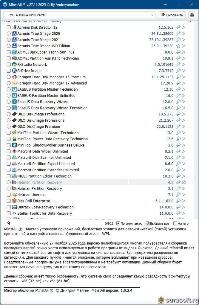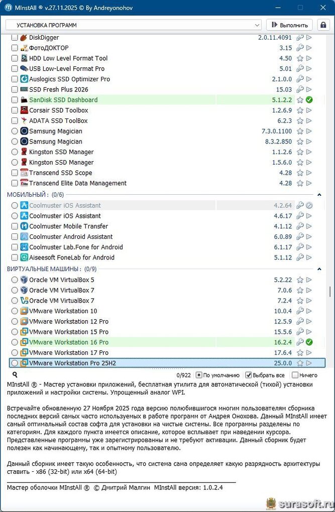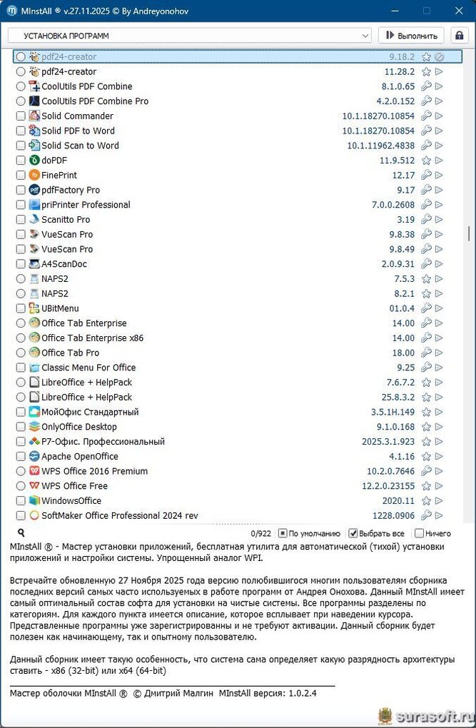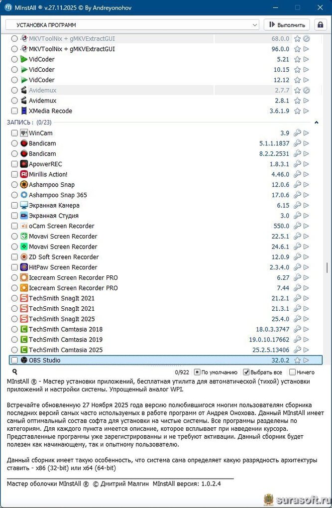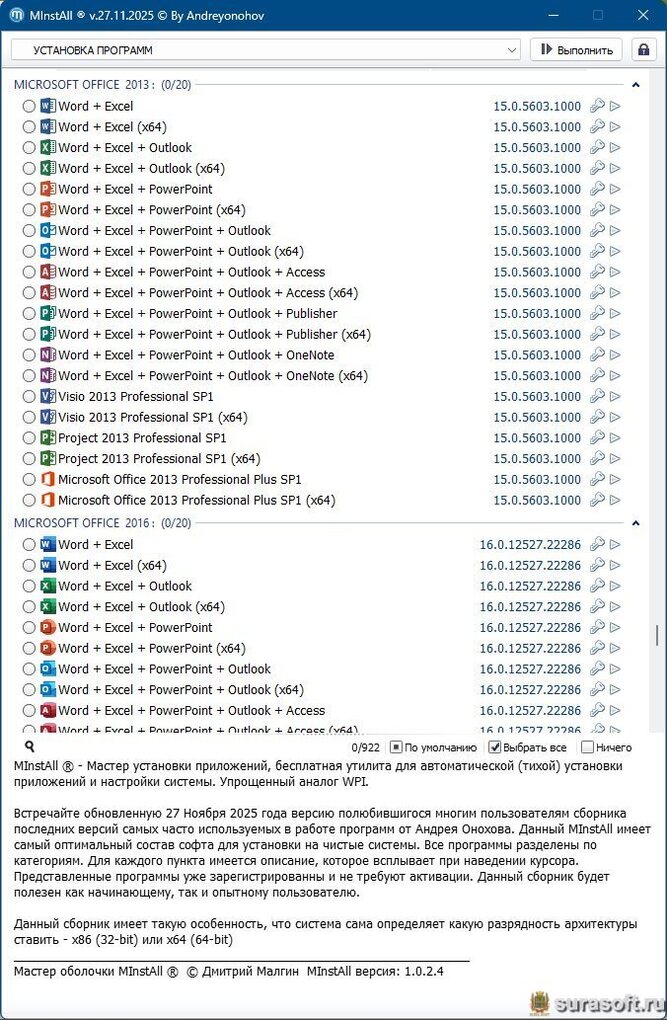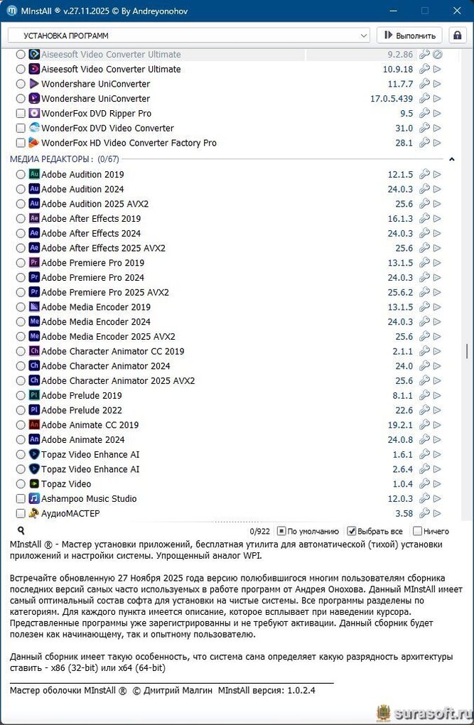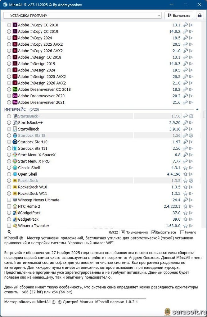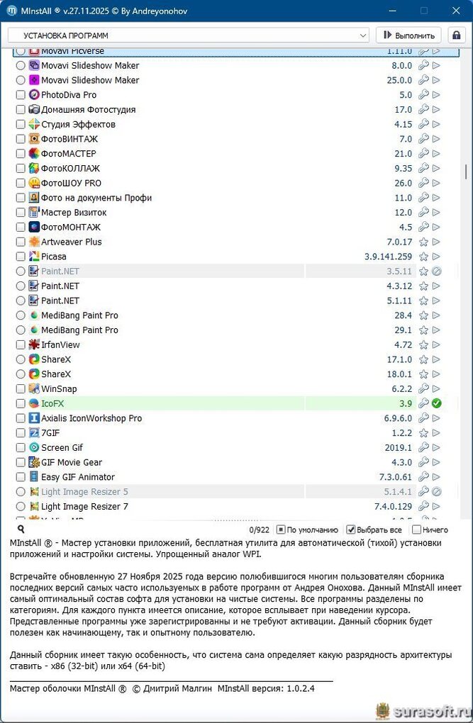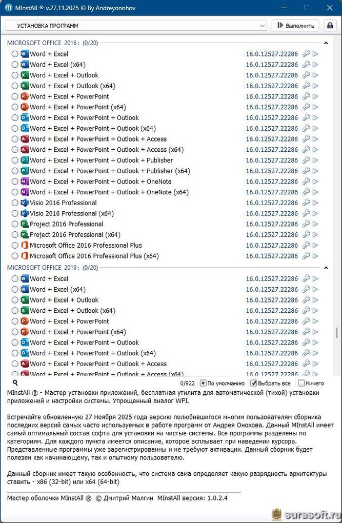 Версия программы: v.27.11.2025Официальный сайт: MInstAll By Andreyonohov Язык интерфейса: РусскийЛечение: не требуется (инсталлятор уже пролечен) Системные требования: • Windows XP - 11 Описание: Перед Вами обновленный 27 Ноября 2025 года полюбившийся многим пользователям сборник последних версий самых часто используемых в работе программ от Андрея Онохова. Теперь в новой, более простой и удобной оболочке MInstAll - это новый мастер установки приложений, упрощенный аналог WPI. Данный MInstAll имеет самый оптимальный состав софта для установки на чистые системы. Представленные программы уже зарегистрированы и не требуют активации. ВАЖНО:• Ко многим программам применены "лекарства".• Поэтому во избежании ложных срабатываний антивирусов рекомендуется их отключить или добавить исключения. Особенности:• Все программы разделены по категориям.• Для каждого пункта имеется описание, которое появляется внизу окна при наведении курсора. • Данный сборник будет полезен как начинающему, так и опытному пользователю. • Данный сборник имеет такую особенность, что система сама определяет какую разрядность архитектуры ставить - x86 (32-bit) или x64 (64-bit). • Обо всех изменениях по сравнению с предыдущей версией читайте ниже. Список программ x86/x64 от 27.11.2025:• АКТИВАЦИЯ:Windows & Office 10.5 KMS Tools Lite Portable 24_10_2025 KMS Tools Portable 08_03_2025 -KMSoffline v2.4.7 RU EN -Activation Program v1.07/v1.14/v1.15 Portable -AAct v4.3.2 Portable -AAct Network v1.4.3 Portable -KMSAuto Lite Portable v1.9.9.9 b06 -W10 Digital Activation Program Portable v1.5.5.4/v1.5.5.5 -Office Installer+ v1.25/v1.31/v1.33 -Defender Tools v1.15 b10 -MSAct++ v2.09/v2.10 -PIDKey Lite v1.64.4 b46/b52 RU EN and more -Office 2013-2024 C2R Install++ v7.7.7.7 r25/r27 -Office Uninstall v2.0.2 -KMSAuto Net 2016 v1.5.4 Portable -KMSCleaner v2.5.1 Portable -ClearTemp v1.60 Portable -ConsoleAct v3.4 Portable -MSActBackUp Portable v1.2.8 -Garbage Collector v1.3.8 x86_x64_31_10_2020 =============================================== KMSAuto++ Portable v1.8.7/v1.9.9 b06 Microsoft Activation Scripts (MAS) 3.9 Windows Loader v.2.2.2 • СИСТЕМНЫЕ: Microsoft .NET Framework 1.1-4.0 (x86) - (XP) Microsoft .NET Framework 3.5 (x86/x64) (22.04.2019) - (8.1-11) Microsoft .NET Framework 4.8 (x86/x64) (01.05.2021) - (7-10) Microsoft .NET Framework 4.8.1 (x86/x64) - ((10/11)) Microsoft .NET Runtime 8.0.22/9.0.11/10.0 (x86/x64) - (7-11) Microsoft Edge WebView2 Runtime 109.0.1518.78 (x86/x64) - (7-8.1) Microsoft Edge WebView2 Runtime 142.0.3595.94 (x86/x64) - (10/11) Microsoft Silverlight 5.1.50918.0 (x86/x64) DirectX (июнь 2010) (x86/x64) Java SE Runtime Environment 7.0 Update 80 (x86/x64) - (XP-8.1) Java SE Runtime Environment 8.0 Update 471 (x86/x64) - (7-11) Java SE Development Kit 25.0.1 (x64) - (7-11) RuntimePack Lite 20.3.3 (x86/x64) Microsoft Visual C++ 2005-2008-2010-2012-2019 Redistributable Package (x86/x64) (09.04.2022) - (XP-11) Microsoft Visual C++ 2015-2022 Redistributable (x86/x64) - 14.44.35211.0 - (7-11) Microsoft Visual C++ 2026 Redistributable (x86/x64) - 14.50.35719.0 - (8.1-11) UpdatePack-XPSP3-Rus Live + Internet Explorer 8 + wmp11 19.11.15 (x86) - (XP) UpdatePack7R2 for Windows 7 SP1 + Internet Explorer 11 22.2.10 (x86/x64) - (7) • ОБСЛУЖИВАНИЕ ОС: AusLogics BoostSpeed 5.5.1.0 (06.05.2019) - (XP-8.1) Auslogics BoostSpeed 14.1.0.0 - (7-11) Ashampoo WinOptimizer 28.00.20 - (7-11) Advanced SystemCare Pro 19.0.1.160 Wise Care 365 Pro 7.3.2.716 Glary Utilities Pro 6.34.0.38 Windows 7 Manager 5.2.0 - (7) Windows 8 Manager 2.2.8 - (8.1) Windows Manager 2.2.1 - (10/11) WinTools.net Premium 25.12.1 WinUtilities Professional 15.89 Cacheman 10.70.0.4 O&O Defrag Professional 25.0.7210 (x86/x64) - (7-11) O&O Defrag Professional 30.5.1211 (x64) - (8.1-11) Raxco PerfectDisk Professional Business 14.0.900 Smart Defrag Pro 11.1.0.466 Defraggler Professional 2.22.99.5 (03.05.2019) DiskTrix UltimateDefrag 6.1.2.0 Auslogics Disk Defrag Pro 12.1.0.0 Auslogics Disk Defrag Ultimate 4.13.0.3 CCleaner Professional 5 64.7577 - (XP/Vista) CCleaner Professional 6.39.11548 - (7-11) CleanMyPC 1.12.2.2178 jv16 PowerTools 4.2.0.1894 - (XP/Vista) jv16 PowerTools 8.1.0.1564 - (7-11) Reg Organizer 9.89 Registry Trash Keys Finder Full 3.9.4.0 (19.02.2018) Vit Registry Fix Pro 14.9.4 Registry Workshop 5.1.0 Autorun Organizer 6.30 AnVir Task Manager 9.4.0 Process Lasso Pro 16.1.0.46 Process Hacker 3.0.4953 (31.03.2023) System Explorer 7.0.0.5356 • ИНТЕРНЕТ: Viber 17.5.1.2 (x86/x64) - (7-10) Viber 26.7.1.0 (x64) - (10/11) Zoom 5.17.11.34827 (x86/x64) - (7/8.1) Zoom 6.6.10.22255 (x86/x64) - (10/11) Bitrix24 Desktop 19.0.23.89 Telegram Desktop 6.3.4 (x86/x64) MAX Desktop 25.17.0 (x64) - (10/11) Mozilla Thunderbird 115.18.0 (x86/x64) - (7/8.1) Mozilla Thunderbird 145.0 (x86/x64) - (10/11) eM Client Pro 7.2.40748.0 - (XP-11) eM Client Pro 10.3.2619.0 - (7-11) Mailbird 3.0.10.0 - (7-11) Mailbird 3.0.44.0 - (10/11) MailWasher Pro 7.15.45 The Bat! Professional 9.1.18 (x86