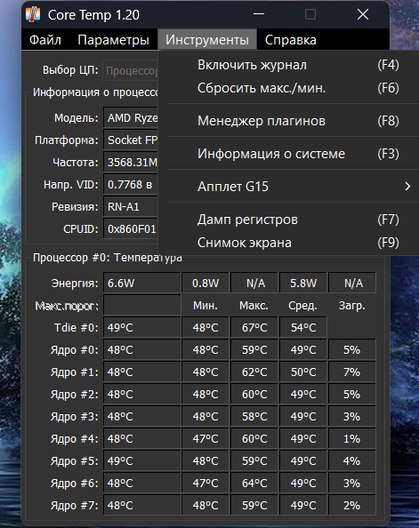 Core Temp - программа для контроля температуры процессора. Core Temp может показывать температуру каждого отдельного ядра в каждом процессоре, имеющемся в системе. С помощью этой утилиты можно в реальном времени наблюдать, как меняется температура ядра процессора в зависимости от нагрузки. Core Temp позволяет записывать изменения температуры процессоров в течение определенного времени с последующей передачей данных в Excel. Программа Core Temp позволяет контролировать температуру сенсора на процессорах Intel Core и Core 2, а также всего семейства AMD K8. Показания более менее приближены к реальным, так как данные считываются с термосенсора, расположенного около самой горячей части внутри ядра процессора.