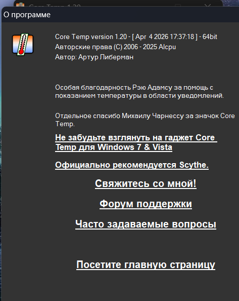 Версия программы: 1.20 Официальный сайт: Core Temp Язык интерфейса: и другие Лечение: не требуется Системные требования: Microsoft Windows XP | Vista | 7 | 8 | 8.1 | 10 | 2003 Server, 2008 Server (R2), 2012 Server | (x86/32-bit), (x64/64-bit) Processor: Intel, AMD or VIA x86 based processor. Описание: