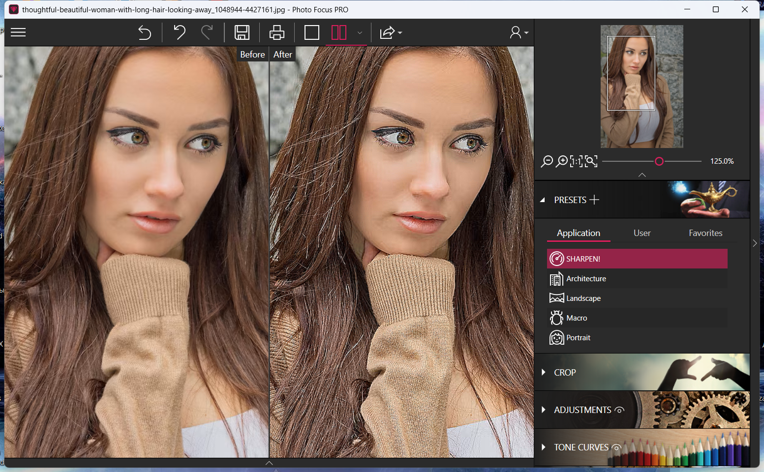 Увеличение резкости фотографий с простой в использовании функцией резкости фокуса 1 щелчком для архитектуры, портретов и крупных планов (макросы)