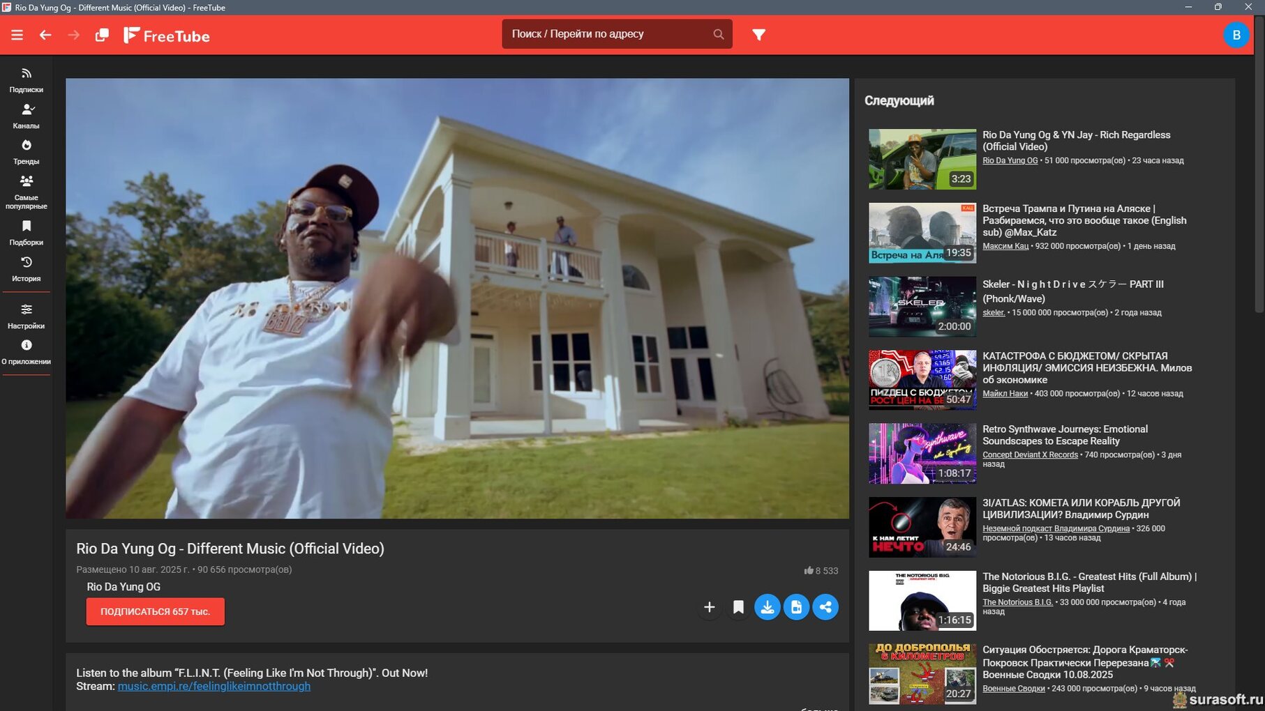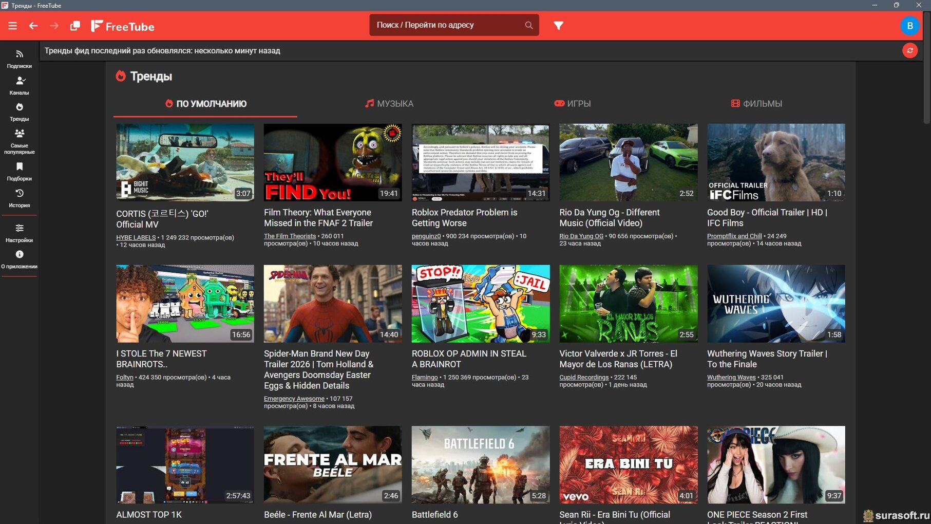 Интерфейс программы: сверху поиск, ниже слева на боковой панели располагаются подписки, тренды, самые популярные видео, история просмотров, справа список видео;