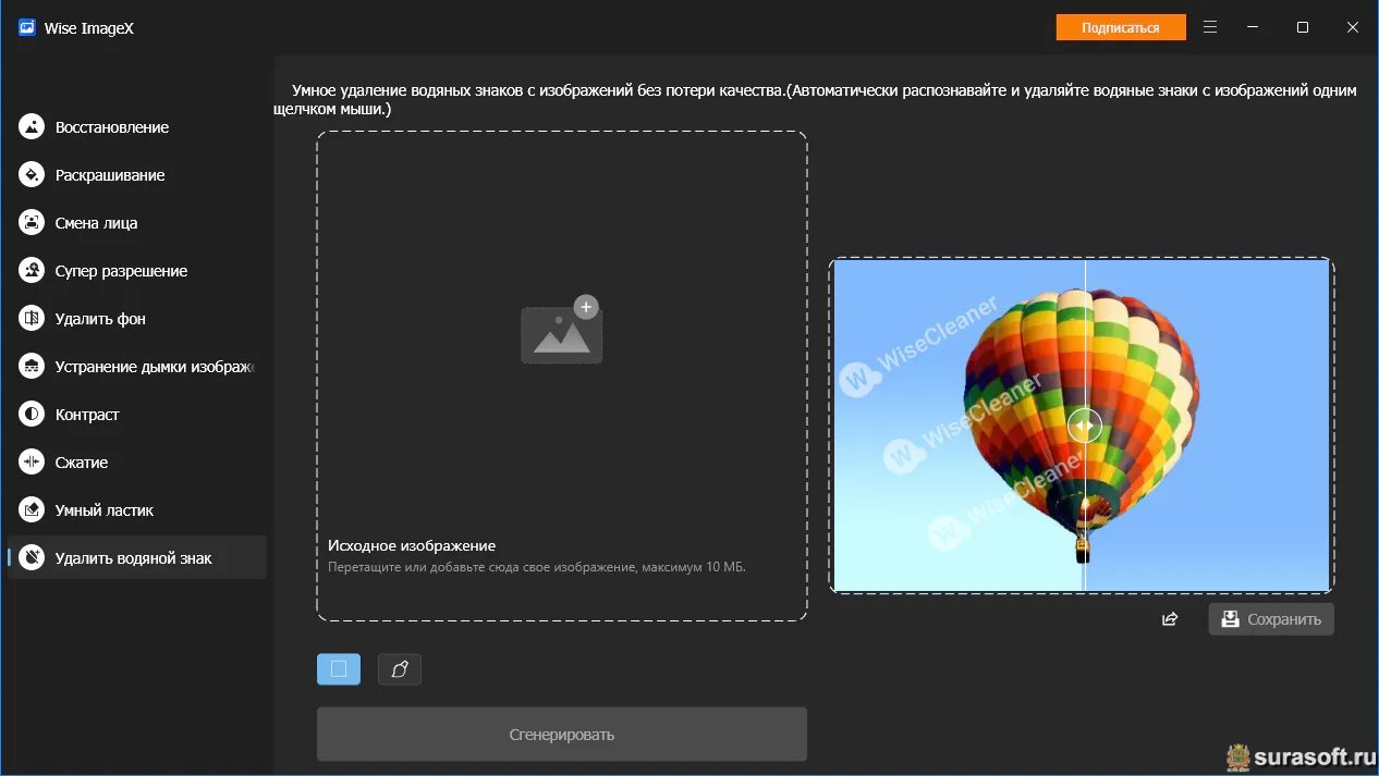 Сотрите ненужный объект на картинке одним щелчком мыши и заполните стертую область с помощью алгоритмов искусственного интеллекта, чтобы восстановить целостность изображения. • Сжатие изображений.