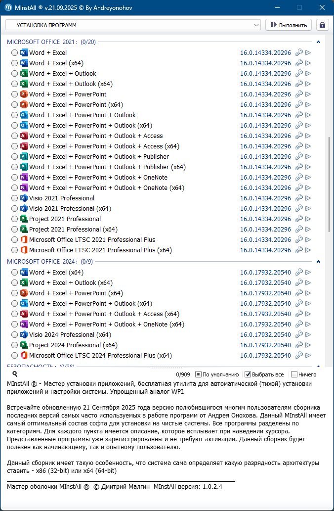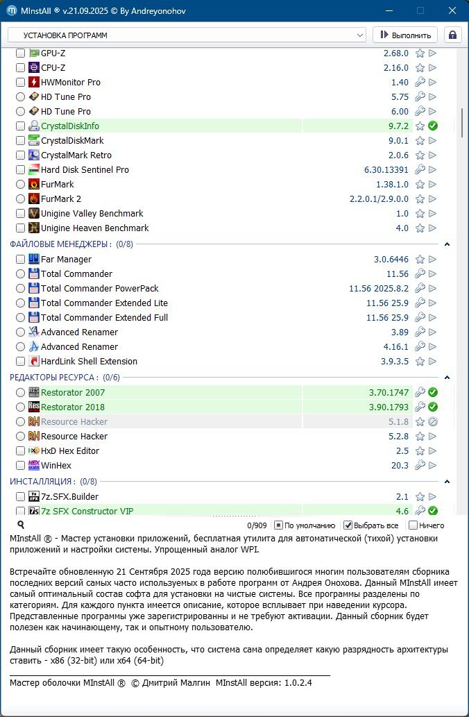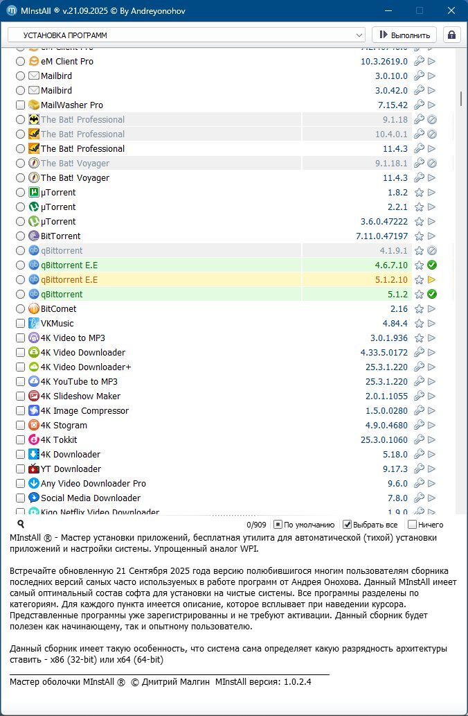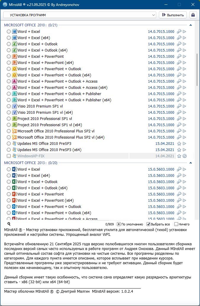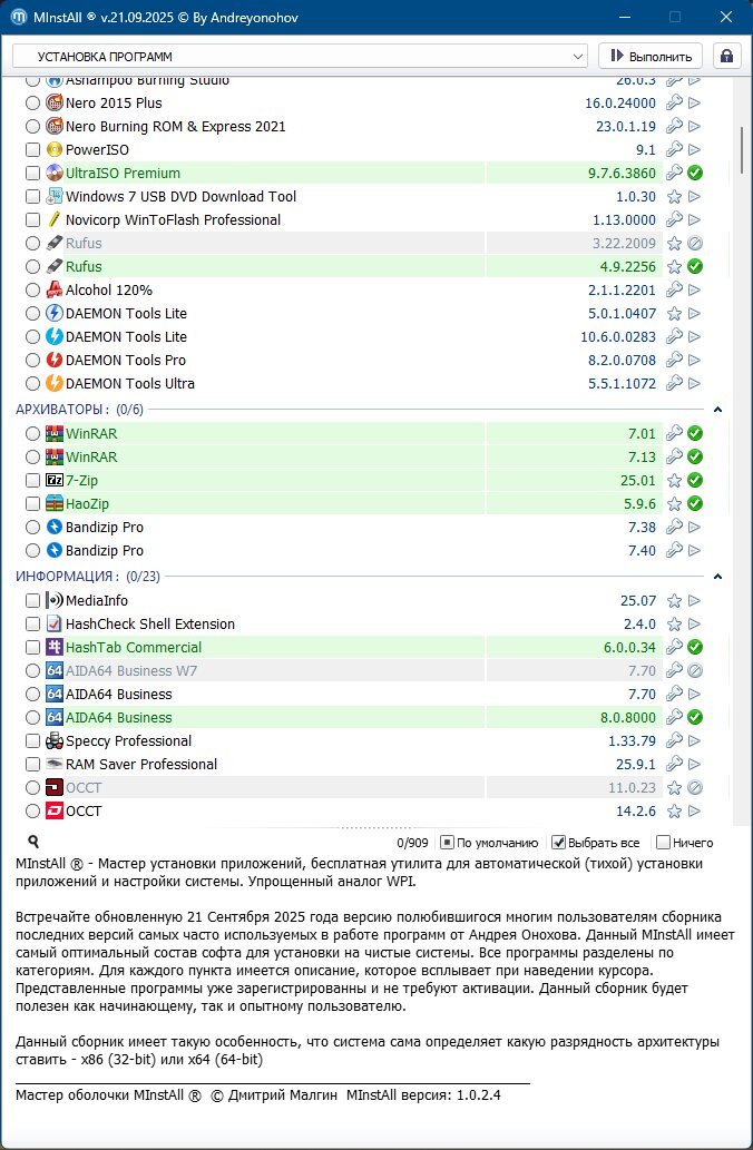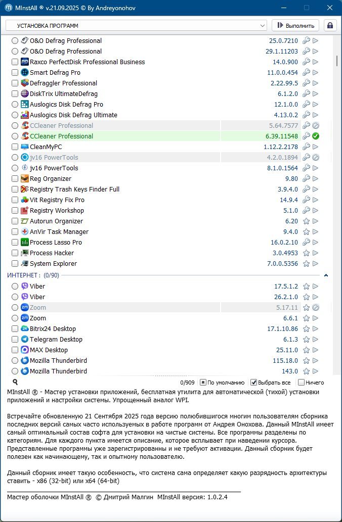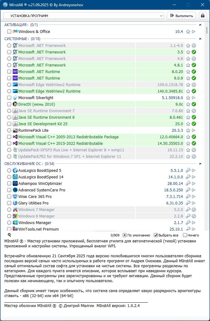 Версия программы: v.21.09.2025Официальный сайт: MInstAll By Andreyonohov Язык интерфейса: РусскийЛечение: не требуется (инсталлятор уже пролечен) Системные требования: • Windows XP - 11 Описание: Перед Вами обновленный 21 Сентября 2025 года полюбившийся многим пользователям сборник последних версий самых часто используемых в работе программ от Андрея Онохова. Теперь в новой, более простой и удобной оболочке MInstAll - это новый мастер установки приложений, упрощенный аналог WPI. Данный MInstAll имеет самый оптимальный состав софта для установки на чистые системы. Представленные программы уже зарегистрированы и не требуют активации. ВАЖНО:• Ко многим программам применены "лекарства".• Поэтому во избежании ложных срабатываний антивирусов рекомендуется их отключить или добавить исключения. Особенности:• Все программы разделены по категориям.• Для каждого пункта имеется описание, которое появляется внизу окна при наведении курсора. • Данный сборник будет полезен как начинающему, так и опытному пользователю. • Данный сборник имеет такую особенность, что система сама определяет какую разрядность архитектуры ставить - x86 (32-bit) или x64 (64-bit). • Обо всех изменениях по сравнению с предыдущей версией читайте ниже. Список программ x86/x64 от 21.09.2025:• АКТИВАЦИЯ:Windows & Office 10.4 KMS Tools Lite Portable 06_07_2025 KMS Tools Portable 08_03_2025 -KMSoffline v2.4.7 RU EN -Activation Program v1.07/v1.12 b07 Portable -AAct v4.3.2 Portable -AAct Network v1.4.2 Portable -KMSAuto Lite Portable v1.9.9.9 b06 -W10 Digital Activation Program Portable v1.5.5.4 -Office Installer+ v1.25/v1.29 -Defender Tools v1.1.5 b10 -MSAct++ v2.09 -PIDKey Lite v1.64.4 b46 RU EN and more -Office 2013-2024 C2R Install++ v7.7.7.7 r25/r26 -Office Uninstall v2.0.2 -KMSAuto Net 2016 v1.5.4 Portable -KMSCleaner v2.5.1 Portable -ClearTemp v1.6.0 Portable -ConsoleAct v3.4 Portable -MSActBackUp Portable v1.2.8 -Garbage Collector v1.3.8 x86_x64_31_10_2020 =============================================== KMSAuto++ Portable v1.8.7/v1.9.9 b06 Microsoft Activation Scripts (MAS) 3.7 Windows Loader v.2.2.2 • СИСТЕМНЫЕ: Microsoft .NET Framework 1.1-4.0 (x86) - (XP) Microsoft .NET Framework 3.5 (x86/x64) (22.04.2019) - (8.1-11) Microsoft .NET Framework 4.8 (x86/x64) (01.05.2021) - (7-10) Microsoft .NET Framework 4.8.1 (x86/x64) - ((10/11)) Microsoft .NET Runtime 8.0.20/9.0.9 (x86/x64) - (7-11) Microsoft Edge WebView2 Runtime 109.0.1518.78 (x86/x64) - (7-8.1) Microsoft Edge WebView2 Runtime 140.0.3485.81 (x86/x64) - (10/11) Microsoft Silverlight 5.1.50918.0 (x86/x64) DirectX (июнь 2010) (x86/x64) Java SE Runtime Environment 7.0 Update 80 (x86/x64) - (XP-8.1) Java SE Runtime Environment 8.0 Update 461 (x86/x64) - (7-11) Java SE Development Kit 25.0 (x64) - (7-11) RuntimePack Lite 20.3.3 (x86/x64) Microsoft Visual C++ 2005-2008-2010-2012-2019 Redistributable Package (x86/x64) (09.04.2022) - (XP-11) Microsoft Visual C++ 2015-2022 Redistributable (x86/x64) 14.50.35503.0 - (7-11) UpdatePack-XPSP3-Rus Live + Internet Explorer 8 + wmp11 19.11.15 (x86) - (XP) UpdatePack7R2 for Windows 7 SP1 + Internet Explorer 11 22.2.10 (x86/x64) - (7) • ОБСЛУЖИВАНИЕ ОС: AusLogics BoostSpeed 5.5.1.0 (06.05.2019) - (XP-8.1) Auslogics BoostSpeed 14.1.0.0 - (7-11) Ashampoo WinOptimizer 28.00.14 - (7-11) Advanced SystemCare Pro 18.5.0.250 Wise Care 365 Pro 7.3.1.714 Glary Utilities Pro 6.31.0.35 Windows 7 Manager 5.2.0 - (7) Windows 8 Manager 2.2.8 - (8.1) Windows Manager 2.1.7 - (10/11) WinTools.net Premium 25.10.1 WinUtilities Professional 15.89 Cacheman 10.70.0.4 O&O Defrag Professional 25.0.7210 (x86/x64) - (7-11) O&O Defrag Professional 29.1.11203 (x64) - (8.1-11) Raxco PerfectDisk Professional Business 14.0.900 Smart Defrag Pro 11.0.0.454 Defraggler Professional 2.22.99.5 (03.05.2019) DiskTrix UltimateDefrag 6.1.2.0 Auslogics Disk Defrag Pro 12.1.0.0 Auslogics Disk Defrag Ultimate 4.13.0.2 CCleaner Professional 5 64.7577 - (XP/Vista) CCleaner Professional 6.39.11548 - (7-11) CleanMyPC 1.12.2.2178 jv16 PowerTools 4.2.0.1894 - (XP/Vista) jv16 PowerTools 8.1.0.1564 - (7-11) Reg Organizer 9.80 Registry Trash Keys Finder Full 3.9.4.0 (19.02.2018) Vit Registry Fix Pro 14.9.4 Registry Workshop 5.1.0 Autorun Organizer 6.20 AnVir Task Manager 9.4.0 Process Lasso Pro 16.0.2.10 Process Hacker 3.0.4953 (31.03.2023) System Explorer 7.0.0.5356 • ИНТЕРНЕТ: Viber 17.5.1.2 (x86/x64) - (7-10) Viber 26.2.1.0 (x64) - (10/11) Zoom 5.17.11.34827 (x86/x64) - (7/8.1) Zoom 6.6.1.15968 (x86/x64) - (10/11) Bitrix24 Desktop 17.1.10.86 Telegram Desktop 6.1.3 (x86/x64) MAX Desktop 25.11.0 (x64) - (10/11) Mozilla Thunderbird 115.18.0 (x86/x64) - (7/8.1) Mozilla Thunderbird 143.0 (x86/x64) - (10/11) eM Client Pro 7.2.40748.0 - (XP-11) eM Client Pro 10.3.2619.0 - (7-11) Mailbird 3.0.10.0 - (7-11) Mailbird 3.0.42.0 - (10/11) MailWasher Pro 7.15.42 The Bat! Professional 9.1.18 (x86/x64) - (XP/Vista) The Bat! Professional 10.4.0.1 (x86/x64) - (7/8.1) The Bat! Professional 11.4.3 (x86/x64) -