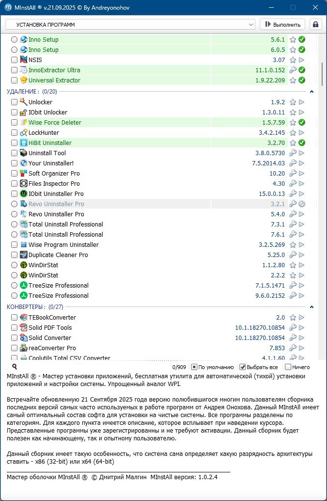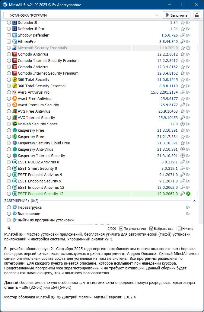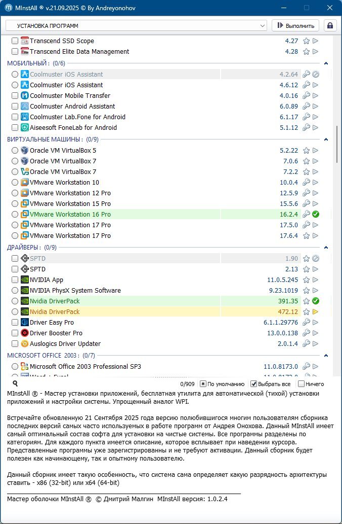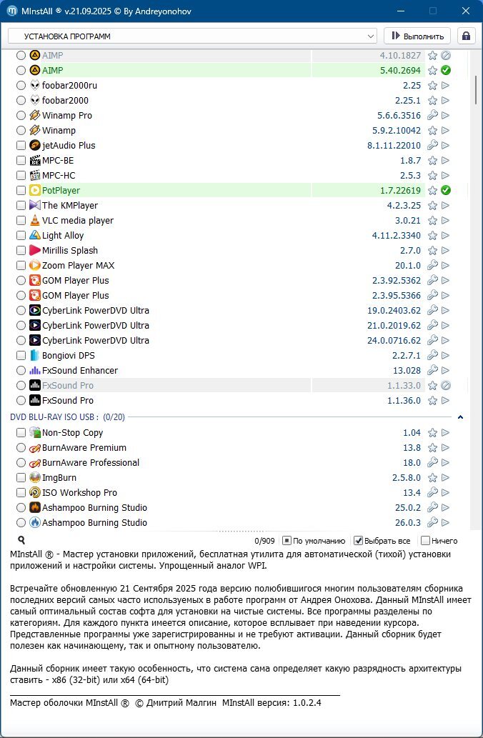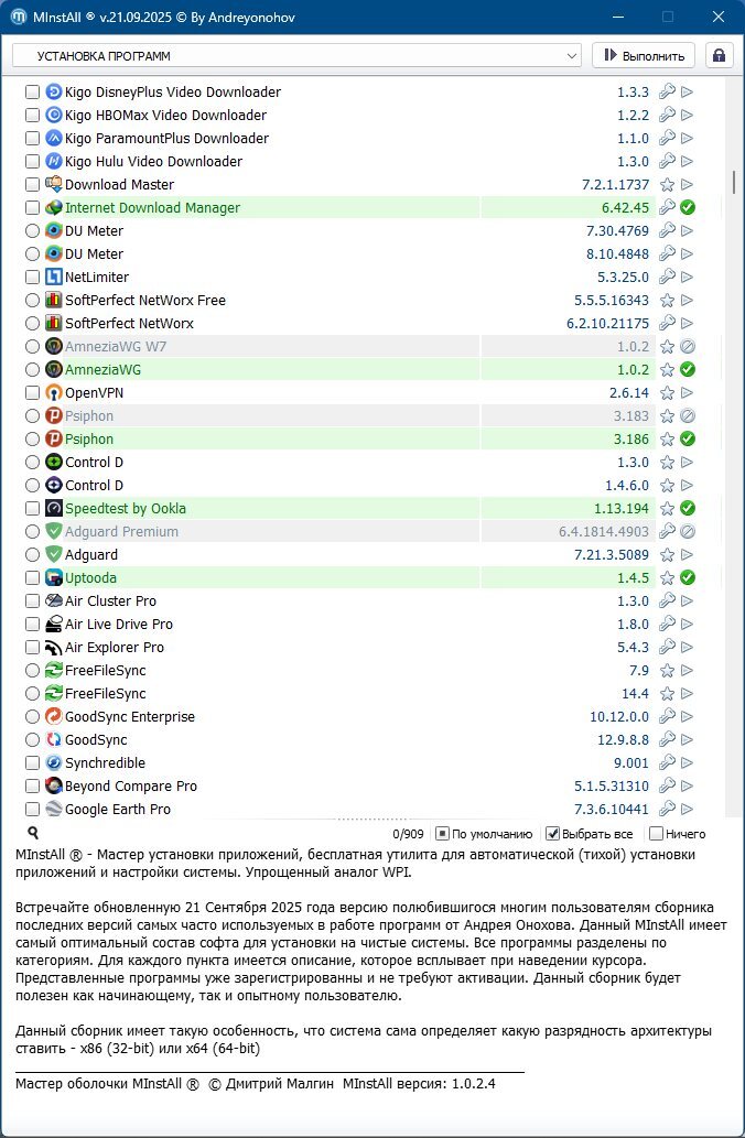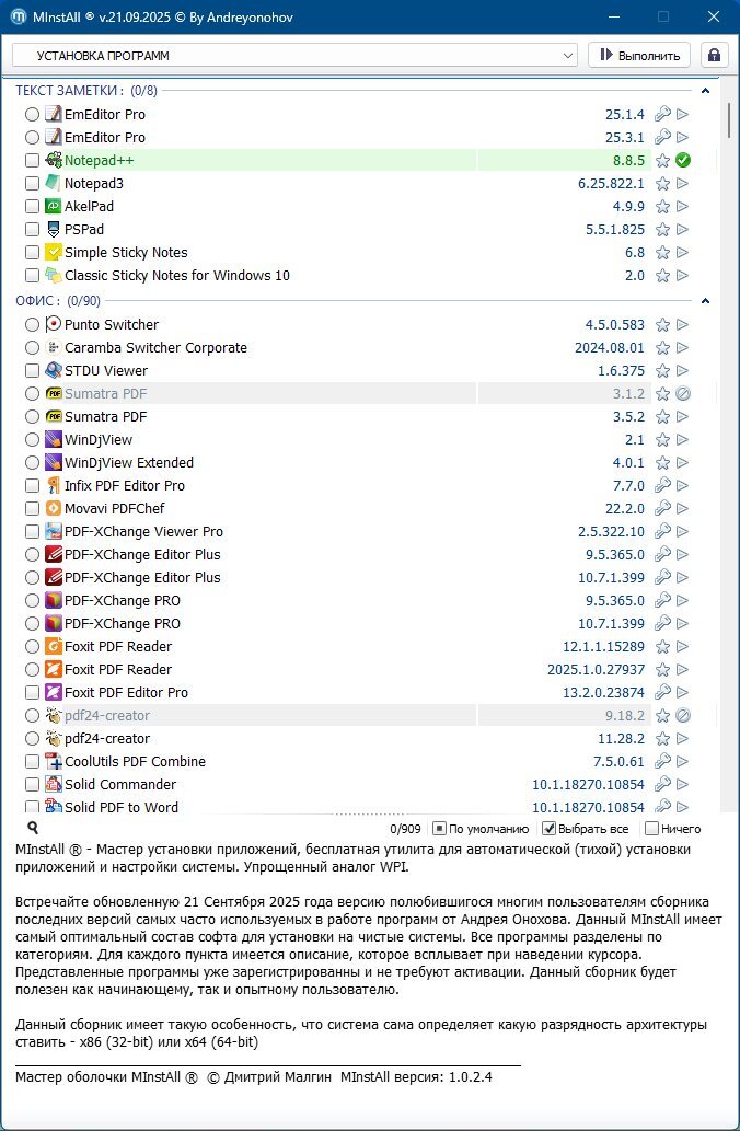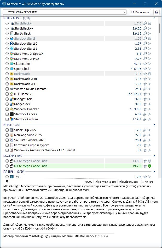 Версия программы: v.21.09.2025Официальный сайт: MInstAll By Andreyonohov Язык интерфейса: РусскийЛечение: не требуется (инсталлятор уже пролечен) Системные требования: • Windows XP - 11 Описание: Перед Вами обновленный 21 Сентября 2025 года полюбившийся многим пользователям сборник последних версий самых часто используемых в работе программ от Андрея Онохова. Теперь в новой, более простой и удобной оболочке MInstAll - это новый мастер установки приложений, упрощенный аналог WPI. Данный MInstAll имеет самый оптимальный состав софта для установки на чистые системы. Представленные программы уже зарегистрированы и не требуют активации. ВАЖНО:• Ко многим программам применены "лекарства".• Поэтому во избежании ложных срабатываний антивирусов рекомендуется их отключить или добавить исключения. Особенности:• Все программы разделены по категориям.• Для каждого пункта имеется описание, которое появляется внизу окна при наведении курсора. • Данный сборник будет полезен как начинающему, так и опытному пользователю. • Данный сборник имеет такую особенность, что система сама определяет какую разрядность архитектуры ставить - x86 (32-bit) или x64 (64-bit). • Обо всех изменениях по сравнению с предыдущей версией читайте ниже. Список программ x86/x64 от 21.09.2025:• АКТИВАЦИЯ:Windows & Office 10.4 KMS Tools Lite Portable 06_07_2025 KMS Tools Portable 08_03_2025 -KMSoffline v2.4.7 RU EN -Activation Program v1.07/v1.12 b07 Portable -AAct v4.3.2 Portable -AAct Network v1.4.2 Portable -KMSAuto Lite Portable v1.9.9.9 b06 -W10 Digital Activation Program Portable v1.5.5.4 -Office Installer+ v1.25/v1.29 -Defender Tools v1.1.5 b10 -MSAct++ v2.09 -PIDKey Lite v1.64.4 b46 RU EN and more -Office 2013-2024 C2R Install++ v7.7.7.7 r25/r26 -Office Uninstall v2.0.2 -KMSAuto Net 2016 v1.5.4 Portable -KMSCleaner v2.5.1 Portable -ClearTemp v1.6.0 Portable -ConsoleAct v3.4 Portable -MSActBackUp Portable v1.2.8 -Garbage Collector v1.3.8 x86_x64_31_10_2020 =============================================== KMSAuto++ Portable v1.8.7/v1.9.9 b06 Microsoft Activation Scripts (MAS) 3.7 Windows Loader v.2.2.2 • СИСТЕМНЫЕ: Microsoft .NET Framework 1.1-4.0 (x86) - (XP) Microsoft .NET Framework 3.5 (x86/x64) (22.04.2019) - (8.1-11) Microsoft .NET Framework 4.8 (x86/x64) (01.05.2021) - (7-10) Microsoft .NET Framework 4.8.1 (x86/x64) - ((10/11)) Microsoft .NET Runtime 8.0.20/9.0.9 (x86/x64) - (7-11) Microsoft Edge WebView2 Runtime 109.0.1518.78 (x86/x64) - (7-8.1) Microsoft Edge WebView2 Runtime 140.0.3485.81 (x86/x64) - (10/11) Microsoft Silverlight 5.1.50918.0 (x86/x64) DirectX (июнь 2010) (x86/x64) Java SE Runtime Environment 7.0 Update 80 (x86/x64) - (XP-8.1) Java SE Runtime Environment 8.0 Update 461 (x86/x64) - (7-11) Java SE Development Kit 25.0 (x64) - (7-11) RuntimePack Lite 20.3.3 (x86/x64) Microsoft Visual C++ 2005-2008-2010-2012-2019 Redistributable Package (x86/x64) (09.04.2022) - (XP-11) Microsoft Visual C++ 2015-2022 Redistributable (x86/x64) 14.50.35503.0 - (7-11) UpdatePack-XPSP3-Rus Live + Internet Explorer 8 + wmp11 19.11.15 (x86) - (XP) UpdatePack7R2 for Windows 7 SP1 + Internet Explorer 11 22.2.10 (x86/x64) - (7) • ОБСЛУЖИВАНИЕ ОС: AusLogics BoostSpeed 5.5.1.0 (06.05.2019) - (XP-8.1) Auslogics BoostSpeed 14.1.0.0 - (7-11) Ashampoo WinOptimizer 28.00.14 - (7-11) Advanced SystemCare Pro 18.5.0.250 Wise Care 365 Pro 7.3.1.714 Glary Utilities Pro 6.31.0.35 Windows 7 Manager 5.2.0 - (7) Windows 8 Manager 2.2.8 - (8.1) Windows Manager 2.1.7 - (10/11) WinTools.net Premium 25.10.1 WinUtilities Professional 15.89 Cacheman 10.70.0.4 O&O Defrag Professional 25.0.7210 (x86/x64) - (7-11) O&O Defrag Professional 29.1.11203 (x64) - (8.1-11) Raxco PerfectDisk Professional Business 14.0.900 Smart Defrag Pro 11.0.0.454 Defraggler Professional 2.22.99.5 (03.05.2019) DiskTrix UltimateDefrag 6.1.2.0 Auslogics Disk Defrag Pro 12.1.0.0 Auslogics Disk Defrag Ultimate 4.13.0.2 CCleaner Professional 5 64.7577 - (XP/Vista) CCleaner Professional 6.39.11548 - (7-11) CleanMyPC 1.12.2.2178 jv16 PowerTools 4.2.0.1894 - (XP/Vista) jv16 PowerTools 8.1.0.1564 - (7-11) Reg Organizer 9.80 Registry Trash Keys Finder Full 3.9.4.0 (19.02.2018) Vit Registry Fix Pro 14.9.4 Registry Workshop 5.1.0 Autorun Organizer 6.20 AnVir Task Manager 9.4.0 Process Lasso Pro 16.0.2.10 Process Hacker 3.0.4953 (31.03.2023) System Explorer 7.0.0.5356 • ИНТЕРНЕТ: Viber 17.5.1.2 (x86/x64) - (7-10) Viber 26.2.1.0 (x64) - (10/11) Zoom 5.17.11.34827 (x86/x64) - (7/8.1) Zoom 6.6.1.15968 (x86/x64) - (10/11) Bitrix24 Desktop 17.1.10.86 Telegram Desktop 6.1.3 (x86/x64) MAX Desktop 25.11.0 (x64) - (10/11) Mozilla Thunderbird 115.18.0 (x86/x64) - (7/8.1) Mozilla Thunderbird 143.0 (x86/x64) - (10/11) eM Client Pro 7.2.40748.0 - (XP-11) eM Client Pro 10.3.2619.0 - (7-11) Mailbird 3.0.10.0 - (7-11) Mailbird 3.0.42.0 - (10/11) MailWasher Pro 7.15.42 The Bat! Professional 9.1.18 (x86/x64) - (XP/Vista) The Bat! Professional 10.4.0.1 (x86/x64) - (7/8.1) The Bat! Professional 11.4.3 (x86/x64) -