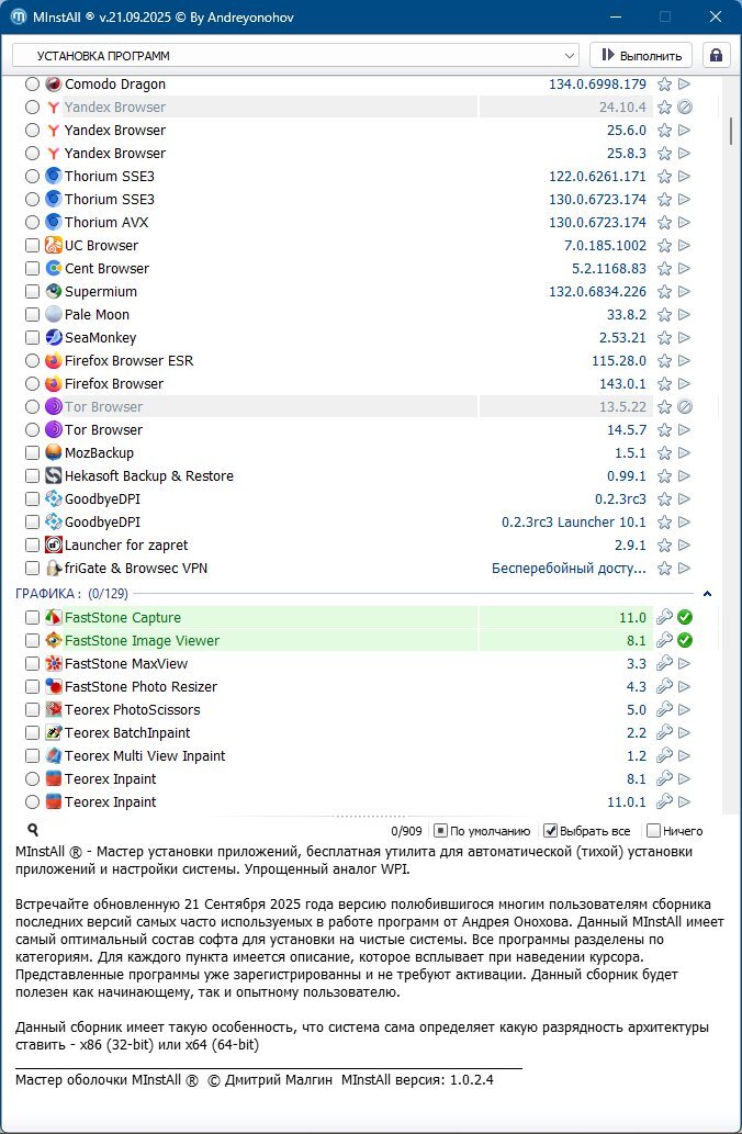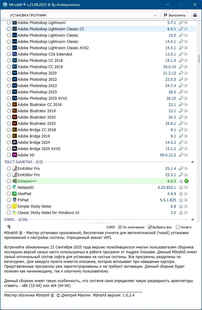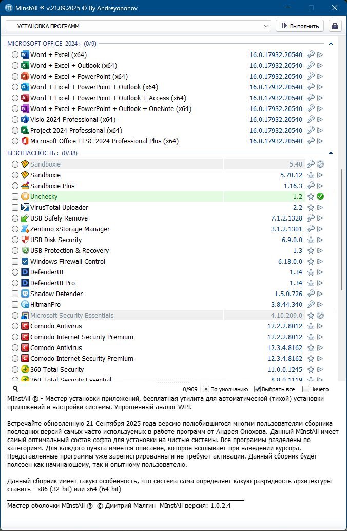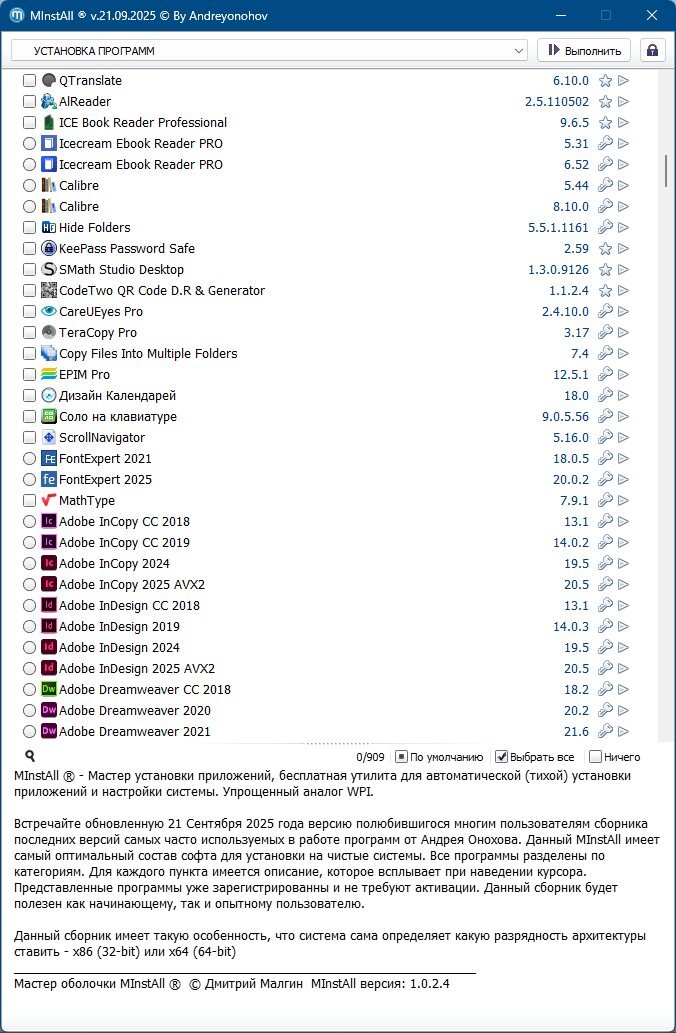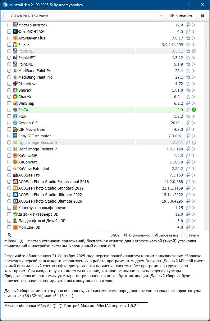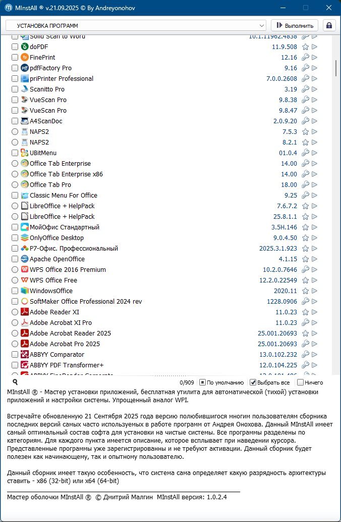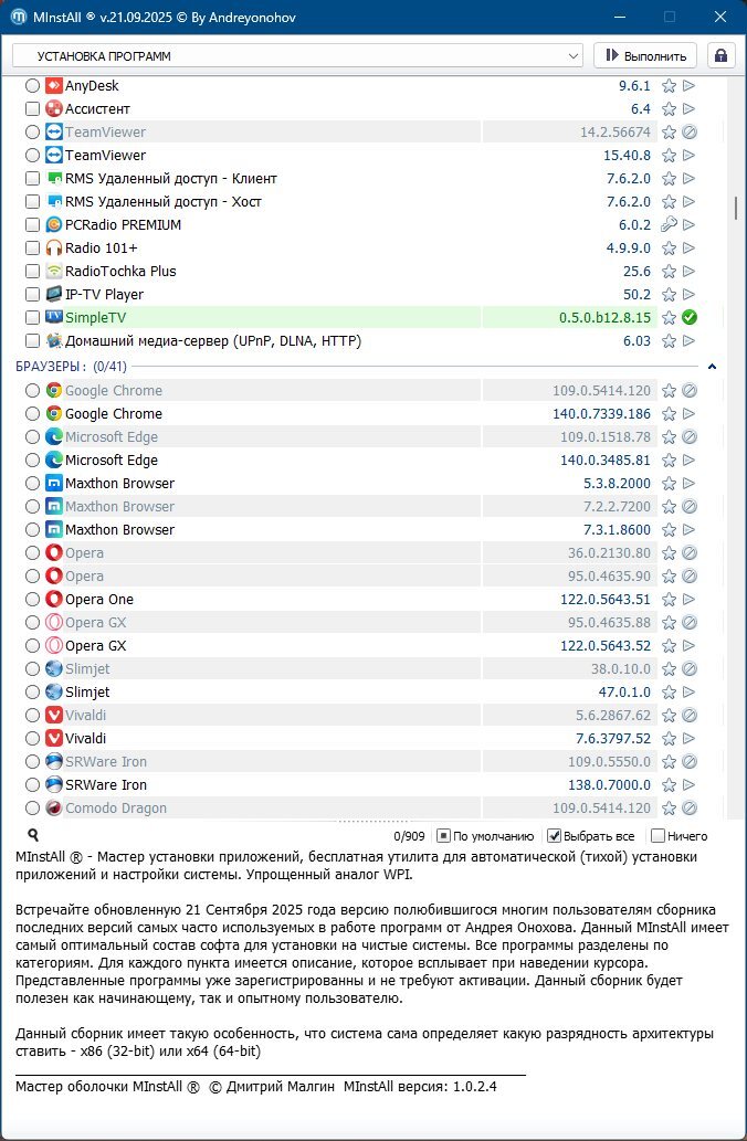 Версия программы: v.21.09.2025Официальный сайт: MInstAll By Andreyonohov Язык интерфейса: РусскийЛечение: не требуется (инсталлятор уже пролечен) Системные требования: • Windows XP - 11 Описание: Перед Вами обновленный 21 Сентября 2025 года полюбившийся многим пользователям сборник последних версий самых часто используемых в работе программ от Андрея Онохова. Теперь в новой, более простой и удобной оболочке MInstAll - это новый мастер установки приложений, упрощенный аналог WPI. Данный MInstAll имеет самый оптимальный состав софта для установки на чистые системы. Представленные программы уже зарегистрированы и не требуют активации. ВАЖНО:• Ко многим программам применены "лекарства".• Поэтому во избежании ложных срабатываний антивирусов рекомендуется их отключить или добавить исключения. Особенности:• Все программы разделены по категориям.• Для каждого пункта имеется описание, которое появляется внизу окна при наведении курсора. • Данный сборник будет полезен как начинающему, так и опытному пользователю. • Данный сборник имеет такую особенность, что система сама определяет какую разрядность архитектуры ставить - x86 (32-bit) или x64 (64-bit). • Обо всех изменениях по сравнению с предыдущей версией читайте ниже. Список программ x86/x64 от 21.09.2025:• АКТИВАЦИЯ:Windows & Office 10.4 KMS Tools Lite Portable 06_07_2025 KMS Tools Portable 08_03_2025 -KMSoffline v2.4.7 RU EN -Activation Program v1.07/v1.12 b07 Portable -AAct v4.3.2 Portable -AAct Network v1.4.2 Portable -KMSAuto Lite Portable v1.9.9.9 b06 -W10 Digital Activation Program Portable v1.5.5.4 -Office Installer+ v1.25/v1.29 -Defender Tools v1.1.5 b10 -MSAct++ v2.09 -PIDKey Lite v1.64.4 b46 RU EN and more -Office 2013-2024 C2R Install++ v7.7.7.7 r25/r26 -Office Uninstall v2.0.2 -KMSAuto Net 2016 v1.5.4 Portable -KMSCleaner v2.5.1 Portable -ClearTemp v1.6.0 Portable -ConsoleAct v3.4 Portable -MSActBackUp Portable v1.2.8 -Garbage Collector v1.3.8 x86_x64_31_10_2020 =============================================== KMSAuto++ Portable v1.8.7/v1.9.9 b06 Microsoft Activation Scripts (MAS) 3.7 Windows Loader v.2.2.2 • СИСТЕМНЫЕ: Microsoft .NET Framework 1.1-4.0 (x86) - (XP) Microsoft .NET Framework 3.5 (x86/x64) (22.04.2019) - (8.1-11) Microsoft .NET Framework 4.8 (x86/x64) (01.05.2021) - (7-10) Microsoft .NET Framework 4.8.1 (x86/x64) - ((10/11)) Microsoft .NET Runtime 8.0.20/9.0.9 (x86/x64) - (7-11) Microsoft Edge WebView2 Runtime 109.0.1518.78 (x86/x64) - (7-8.1) Microsoft Edge WebView2 Runtime 140.0.3485.81 (x86/x64) - (10/11) Microsoft Silverlight 5.1.50918.0 (x86/x64) DirectX (июнь 2010) (x86/x64) Java SE Runtime Environment 7.0 Update 80 (x86/x64) - (XP-8.1) Java SE Runtime Environment 8.0 Update 461 (x86/x64) - (7-11) Java SE Development Kit 25.0 (x64) - (7-11) RuntimePack Lite 20.3.3 (x86/x64) Microsoft Visual C++ 2005-2008-2010-2012-2019 Redistributable Package (x86/x64) (09.04.2022) - (XP-11) Microsoft Visual C++ 2015-2022 Redistributable (x86/x64) 14.50.35503.0 - (7-11) UpdatePack-XPSP3-Rus Live + Internet Explorer 8 + wmp11 19.11.15 (x86) - (XP) UpdatePack7R2 for Windows 7 SP1 + Internet Explorer 11 22.2.10 (x86/x64) - (7) • ОБСЛУЖИВАНИЕ ОС: AusLogics BoostSpeed 5.5.1.0 (06.05.2019) - (XP-8.1) Auslogics BoostSpeed 14.1.0.0 - (7-11) Ashampoo WinOptimizer 28.00.14 - (7-11) Advanced SystemCare Pro 18.5.0.250 Wise Care 365 Pro 7.3.1.714 Glary Utilities Pro 6.31.0.35 Windows 7 Manager 5.2.0 - (7) Windows 8 Manager 2.2.8 - (8.1) Windows Manager 2.1.7 - (10/11) WinTools.net Premium 25.10.1 WinUtilities Professional 15.89 Cacheman 10.70.0.4 O&O Defrag Professional 25.0.7210 (x86/x64) - (7-11) O&O Defrag Professional 29.1.11203 (x64) - (8.1-11) Raxco PerfectDisk Professional Business 14.0.900 Smart Defrag Pro 11.0.0.454 Defraggler Professional 2.22.99.5 (03.05.2019) DiskTrix UltimateDefrag 6.1.2.0 Auslogics Disk Defrag Pro 12.1.0.0 Auslogics Disk Defrag Ultimate 4.13.0.2 CCleaner Professional 5 64.7577 - (XP/Vista) CCleaner Professional 6.39.11548 - (7-11) CleanMyPC 1.12.2.2178 jv16 PowerTools 4.2.0.1894 - (XP/Vista) jv16 PowerTools 8.1.0.1564 - (7-11) Reg Organizer 9.80 Registry Trash Keys Finder Full 3.9.4.0 (19.02.2018) Vit Registry Fix Pro 14.9.4 Registry Workshop 5.1.0 Autorun Organizer 6.20 AnVir Task Manager 9.4.0 Process Lasso Pro 16.0.2.10 Process Hacker 3.0.4953 (31.03.2023) System Explorer 7.0.0.5356 • ИНТЕРНЕТ: Viber 17.5.1.2 (x86/x64) - (7-10) Viber 26.2.1.0 (x64) - (10/11) Zoom 5.17.11.34827 (x86/x64) - (7/8.1) Zoom 6.6.1.15968 (x86/x64) - (10/11) Bitrix24 Desktop 17.1.10.86 Telegram Desktop 6.1.3 (x86/x64) MAX Desktop 25.11.0 (x64) - (10/11) Mozilla Thunderbird 115.18.0 (x86/x64) - (7/8.1) Mozilla Thunderbird 143.0 (x86/x64) - (10/11) eM Client Pro 7.2.40748.0 - (XP-11) eM Client Pro 10.3.2619.0 - (7-11) Mailbird 3.0.10.0 - (7-11) Mailbird 3.0.42.0 - (10/11) MailWasher Pro 7.15.42 The Bat! Professional 9.1.18 (x86/x64) - (XP/Vista) The Bat! Professional 10.4.0.1 (x86/x64) - (7/8.1) The Bat! Professional 11.4.3 (x86/x64) -
