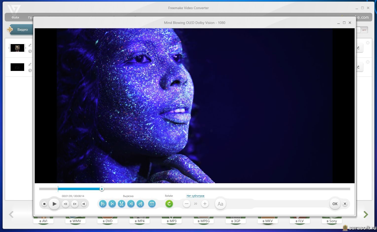 Freemake Video Converter конвертирует видео в таких форматах, как MP4, AVI, MKV, WMV, MP3, DVD, 3GP, SWF, FLV, HD, MOV, RM,QT, Divx, Xvid, TS, Fraps и др. Поддерживаются все современные кодеки: H.264, MKV, MPEG4, AAC. Создавайте видео из аудио и фото. Конвертируйте много файлов одновременно.