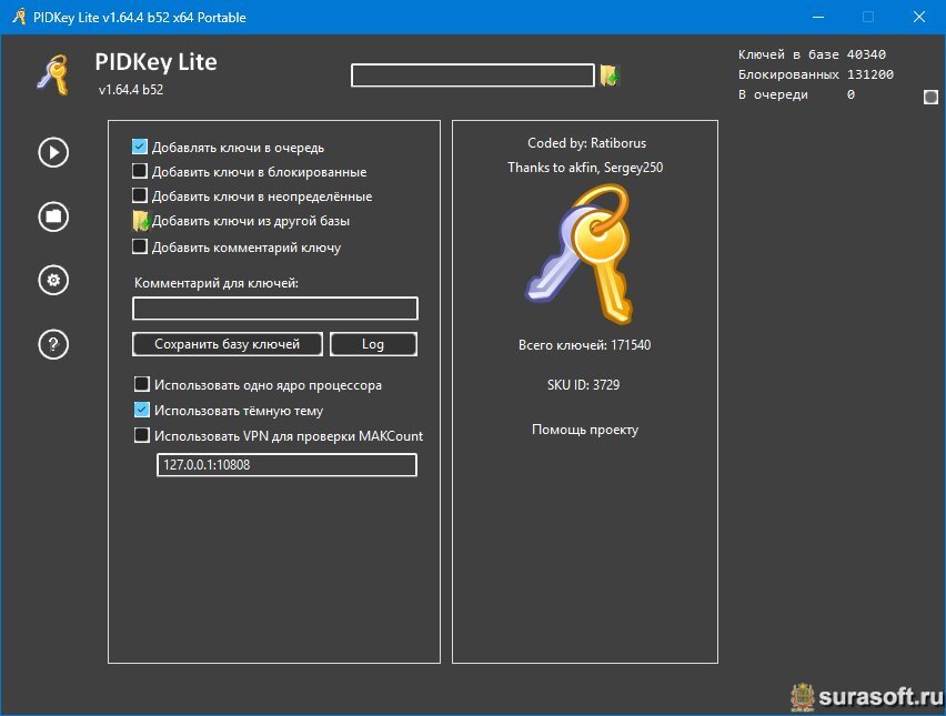 Она позволяет заменить PIDKey by Ratiborus, Ultimate PID Checker by janek2012 и VAMT. Программа PIDKey Lite является правопреемницей PIDKey и взяла из нее лучшие идеи. Основной особенностью программы является создание SQL-базы в отличие от PIDKey, где база фактически хранилась в текстовых файлах. Программа позволяет добавлять новые ключи в двух режимах (режимы добавления ключей будут описаны ниже) и проверять их, находить в базе нужные ключи, обновлять информацию о них и (или) перемещать их в блокированные. ————————————————————————————————— /unpack | /u | /e - Распаковывает базу конфигов рядом с программой RU: