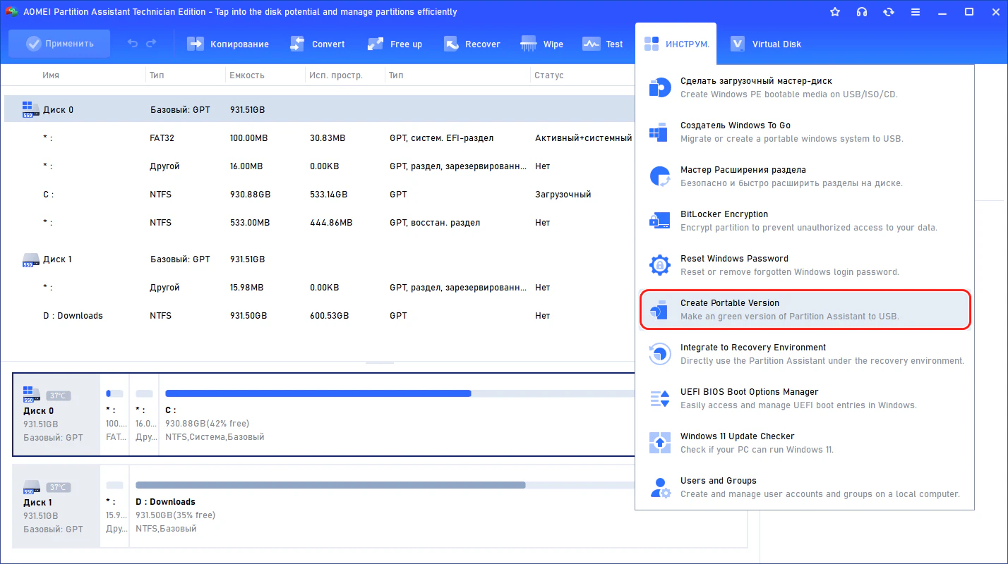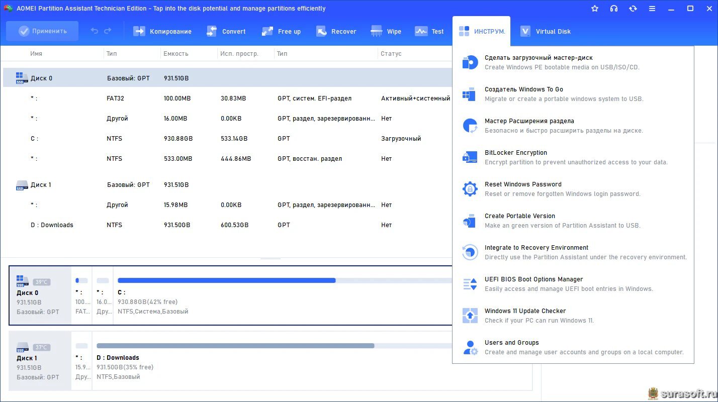Конвертация между GPT и MBR: конвертация с диска GPT на MBR без потери данных и обратно.