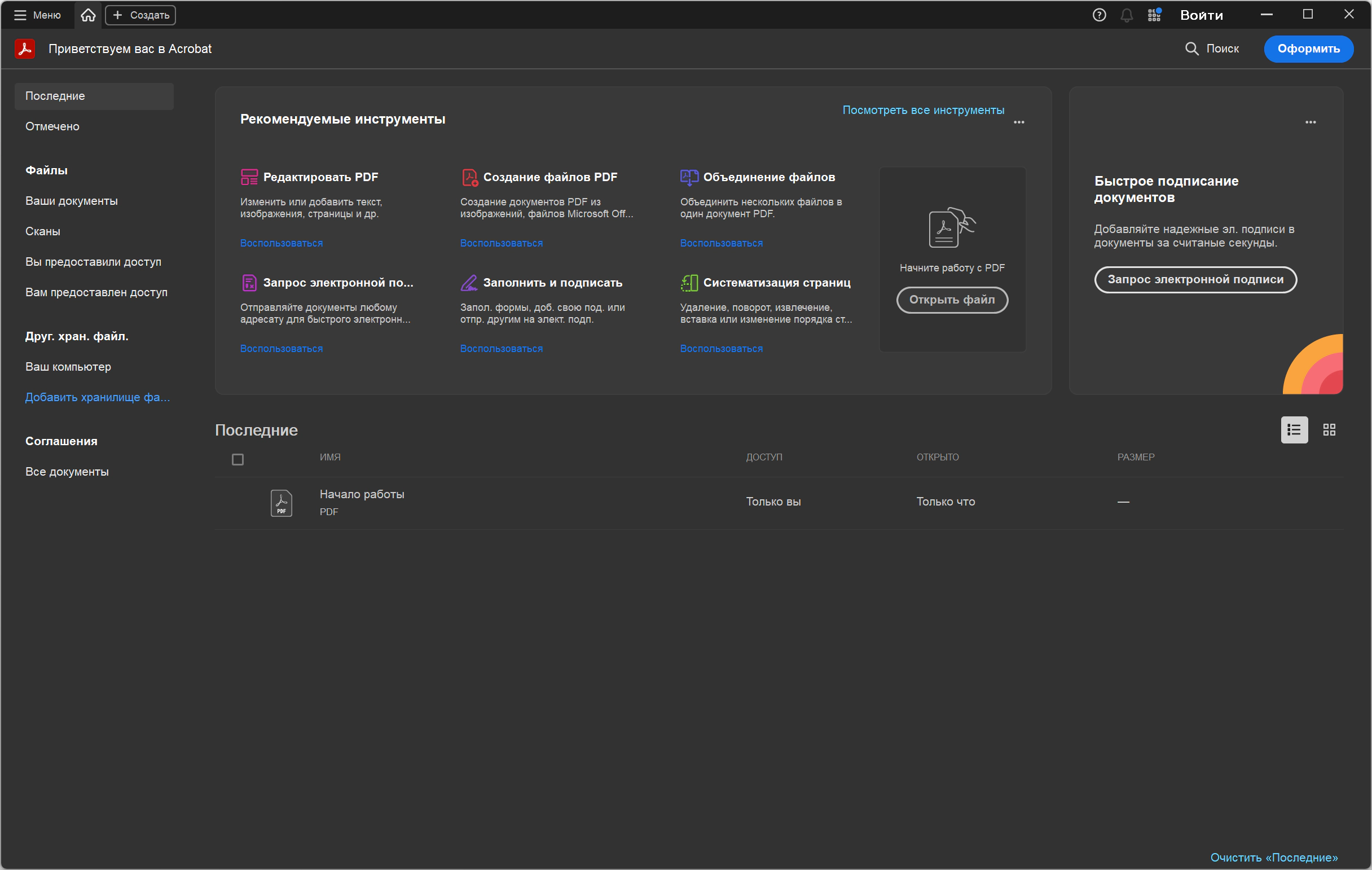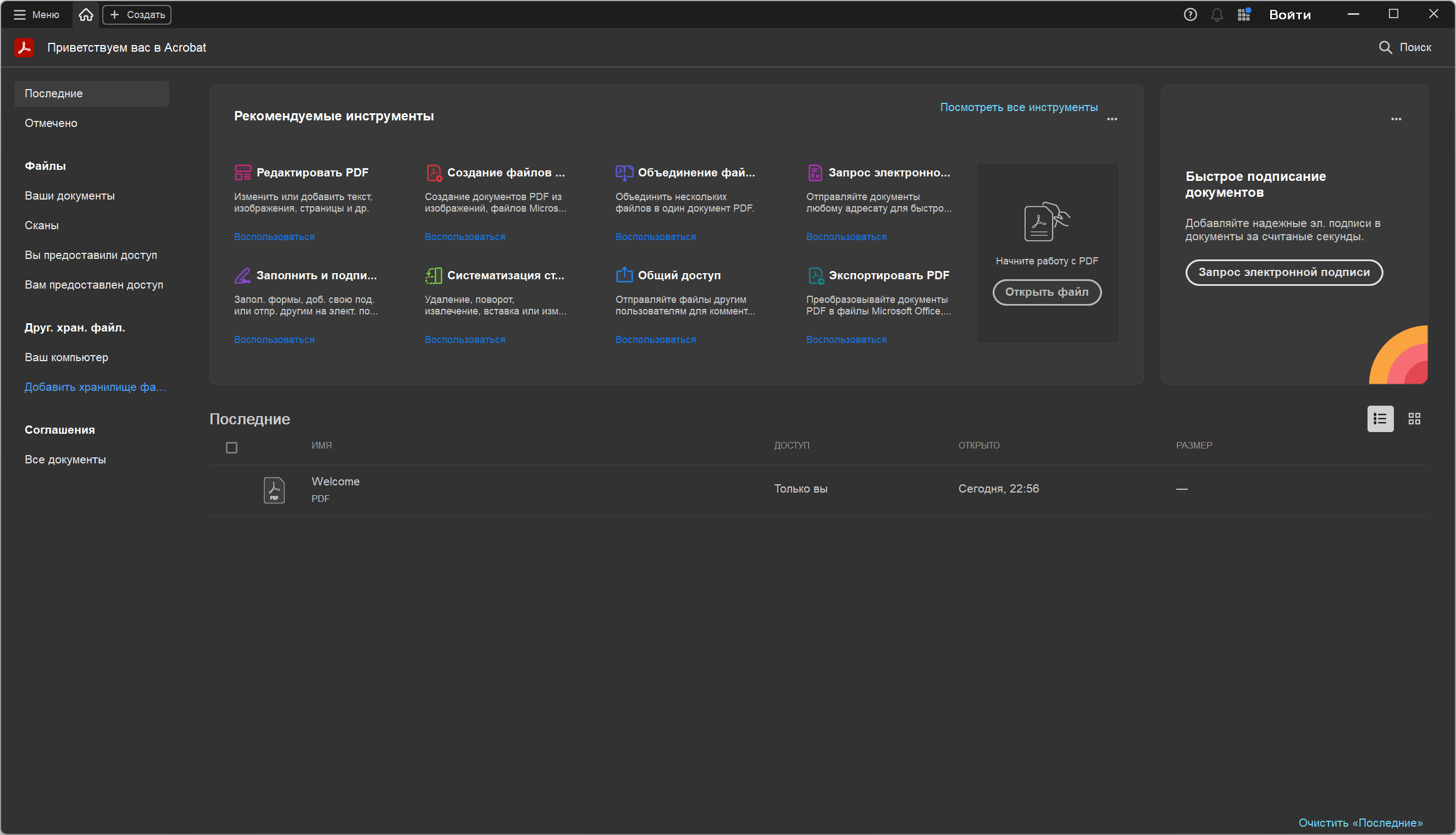 Получайте доступ к инструментам PDF и недавно открытым файлам из офиса, с домашнего компьютера или с мобильного устройства.