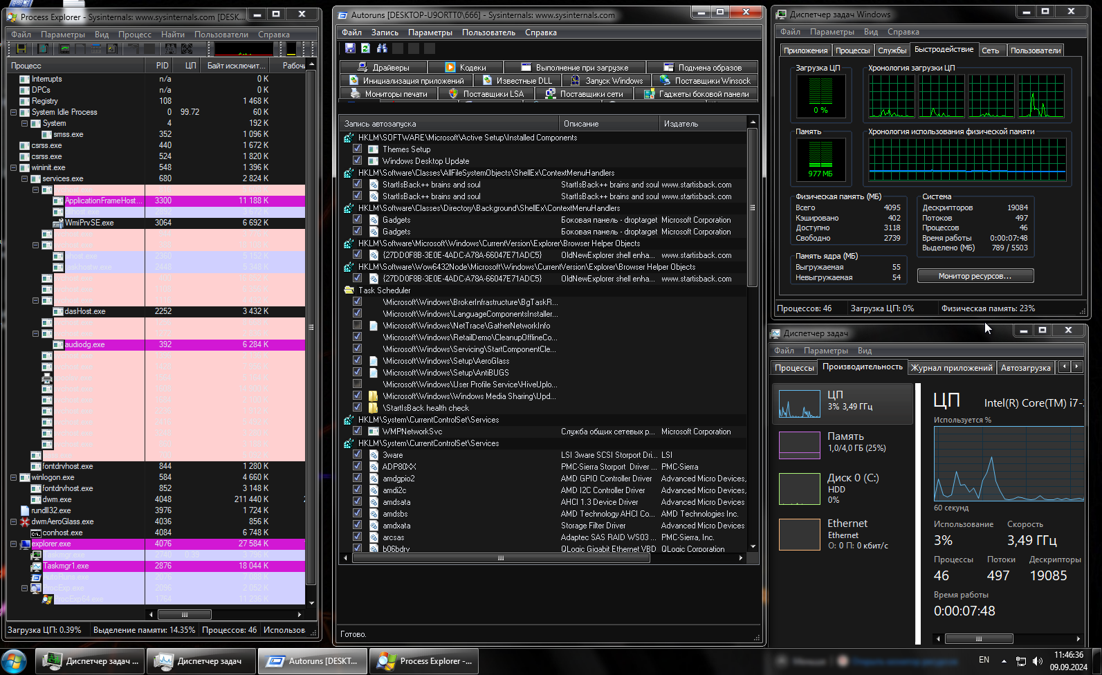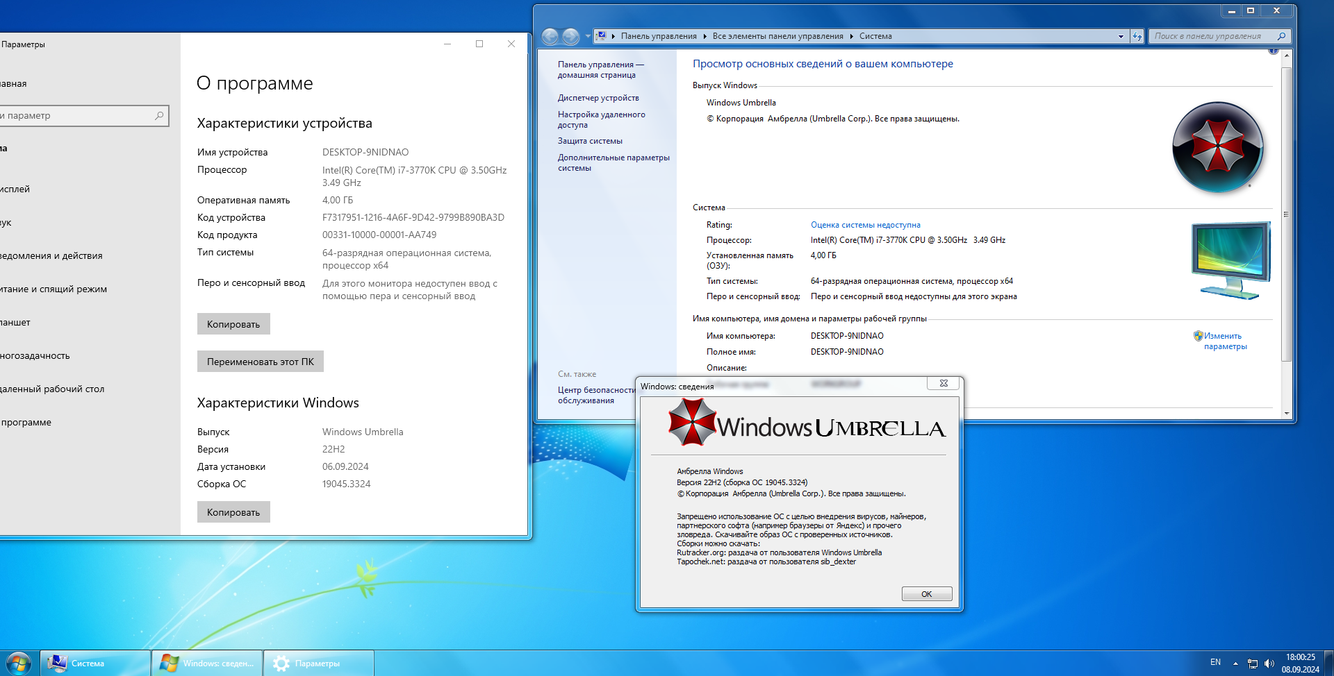 Как вернуть диспетчер задач из windows 10?В окне "Настройки Windows Umbrella" снять галочку в пункте "Диспетчер задач как в Windows 7". Так же в контекстном меню на рабочем столе можно вызывать новый диспетчер задач.При нажатии "пуск" вылазит окно с критической ошибкой, как исправить?Запустить "восстановление меню пуск" через панель управления.Как включить гибернацию?В окне "Настройки Windows Umbrella" поставить галочку в пункте "Разрешить гибернацию".Валятся ошибки Framework с содержимым "PresentationFramework.Umbrella", например в "EGlobalLauncher1. Использовать твик "Включить тему windows 10" в папке "важное".2. Применить темы Windows 10 в персонализации. 3. Запустить программу. Не могу включить сетевое обнаружение, нажимаю включить, сохранить, захожу оно отключено...1. Параметры>> сеть и интернет>> ethernet>> кликнуть на иконку монитора со значком RJ45>> сетевой профиль выбрать "частные".2. Параметры>> сеть и интернет>> ethernet>> сопутствующие параметры: изменение расширенных параметров общего доступа>> во вкладке "частная" включить сетевое обнаружение и нажать сохранить. ПК используется с телевизором 4к 50", наблюдаются фризы, как лечить?Ломается система если через параметры менять масштаб. Но если прописать через реестр, по пути HKEY_CURRENT_USER\Control Panel\Desktop , файл реестра LogPixels, поставить десятеричный параметр и отредактировать значение к примеру на 96 для 100% (по умолчанию), 120 для 125%, 144 для 150%, 192 для 200%, то все отлично.Как вернуть тему windows 10?Использовать твик в папке "важное".Будет ли сборка дизайном Windows XP?Нет.Будет ли сборка на базе windows 11 или на более свежем билде Windows 10?В данный момент нет в планах.Будет ли добавлены более качественные темные темы Vista и 7?На текущий момент таких тем не обнаружено.Description in English:Windows 10 with Windows 7 and Windows Vista interface. The OS is suitable for weak PCs. This OS is suitable for users who do not use Microsoft online services.OS Information:- Design like in Windows 7 or Vista- Performance equivalent to Windows 7 - Support for games on old Directx and new ones (for example: Resident evil 4 remake) - No sponsored content - Extended administrator rights like in Windows 7 - Fully configured turnkey OS - All the plague of the 3rd decade of the 21st century has been removed (surveillance, online services, advertising, etc.) - Automatic installation of Microsoft Visual C++ Redistributable Package 2005-2008-2010-2012-2013-2015-2022 - Gadgets (8 Gadget Pack + duplicate and non-working ones have been removed) - Blocking hidden download of Edge (Chromium) - Much attention has been paid to little things such as launching the task manager with 0 priority, fixing autologin to the last account, etc. - OS works great on HDD - Advanced context menu with many useful little things on the desktop - Embedded NET Framework 3.5 - Emoji from Windows 11 - By default, the task manager is like in Windows 7, (the original can be called from the context menu on the desktop) - Manual activation, via kms - Suitable for use in multi-user mode - Tracking is disabled automatically when the user first logs in. Removed:Removed everything that is not typical for Windows 7All UWP apps: • Microsoft Store and all services, • Photos (Windows Photo Viewer is preserved), • Movies and TV, • Calculator (replaced with the old one from win7), • Maps, • Wallet, • Mail, • Skype, • Weather, • Camera, • Cortana, • OneNote, • Alarm, • Your Phone, • People, • Xbox App, • Xbox Game Bar, • Xbox Identity Provider, • Microsoft Office Hub, • Get Started, • Desktop App Installer, • 3D Viewer, • Microsoft Solitaire Collection, • Microsoft Sticky Notes, • Get Help, • Windows Feedback Hub, • Windows Sound Recorder, • Mixed Reality Portal, • Paint 3D (replaced with the old Paint from win7) And also: • Microsoft Edge (Internet Explorer 11 is available instead) • OneDrive • Update Center • Windows Subsystem for Linux (WSL) • Hyper-V for creating virtual machines in Windows 10 • Defender • Spy modules and tools for resurrecting updates, adware, etc. • Infrastructure for advertising, downloading and distributing updates Programs in OS:1. Programs in the folder C:\Users\Public\General programs, if you don’t need them, then just delete them from the folder and the shortcut from the start.List of programs: HWMonitor - see how hot the computer is victoria - check the disks MouseJiggle - twitches the cursor so that the PC does not lock when connected via RDP PowerOff - all sorts of useful things like computer shutdown schedules ProcExp - see what is running on the computer AutoRuns - see all autoruns in the system ShutUp - shut up10, stop spying! (runs automatically when creating a user) WPD - another s