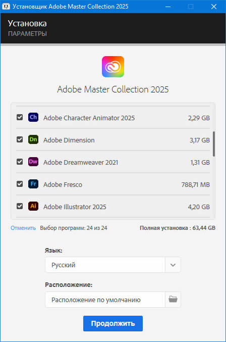 • 64-битная версия Microsoft Windows 10 или Windows 11 • Доступ к Интернету для работы онлайн-сервисов ____ * Полный список системных требований для каждого конкретного продукта см. на следующей странице. Как, надеюсь, вам известно, официально пакета Adobe Master Collection 2025 в природе не существует, компания Adobe его никогда не выпускала. Но, тем не менее, он перед вами! Причем собран он на базе современного инсталлера, производства Adobe, использование которого для этой сборки стало возможным благодаря совместным усилиям вашего покорного слуги и многим известного PainteR'a. Мы оба хорошо постарались, чтобы этот пакет появился на свет. Adobe Master Collection 2025 представляет из себя сборник приложений линейки Creative Cloud 2025, объединенных мультиязычным инсталлером с возможностью выбора пути установки и языка интерфейса устанавливаемых программ. По функционалу все очень похоже на хорошо зарекомендовавший себя в прошлом Adobe Master Collection CS6. Только, вот, интерфейс установщика претерпел серьезные изменения по сравнению с его тезкой линейки Creative Suite 6, несколько изменился состав пакета, да и версии самих программ, определенно, свежее Содержимое пакета