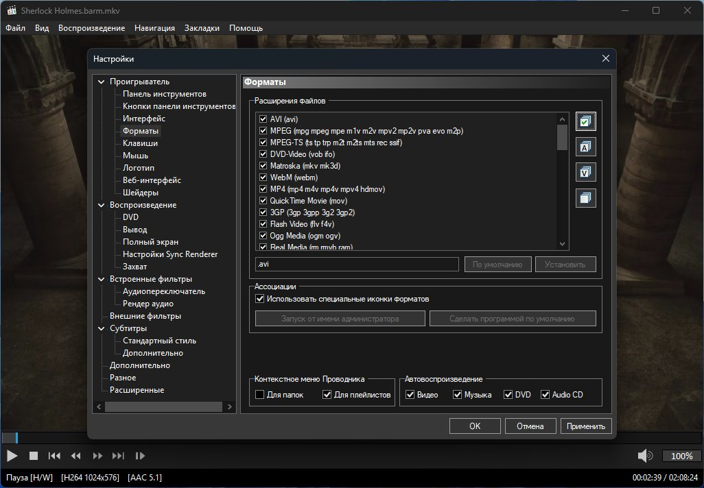 - Воспроизведение файлов любых форматов, поддерживающих DirectShow, например, DivX, XviD, H.264.
